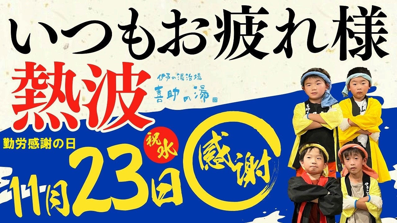 四国サウナの聖地 「喜助の湯」を展開する総合エンターテイメント企業・キスケ株式会社(本社:愛媛県松山市、代表:山路義則)は、2022年11月23日(水)の勤労感謝の日に合わせて、5歳から12歳までの男の子からなる「ちびっこ熱波隊」 による『いつもお疲れ様 熱波』イベントを開催します。