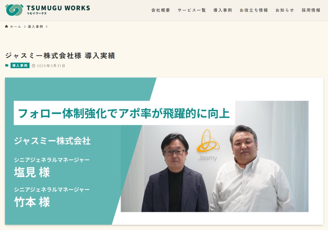 アポイント率が劇的に向上!TSUMUGU WORKSのインサイドセールス支援が、ジャスミー株式会社の営業効率を飛躍的に改善