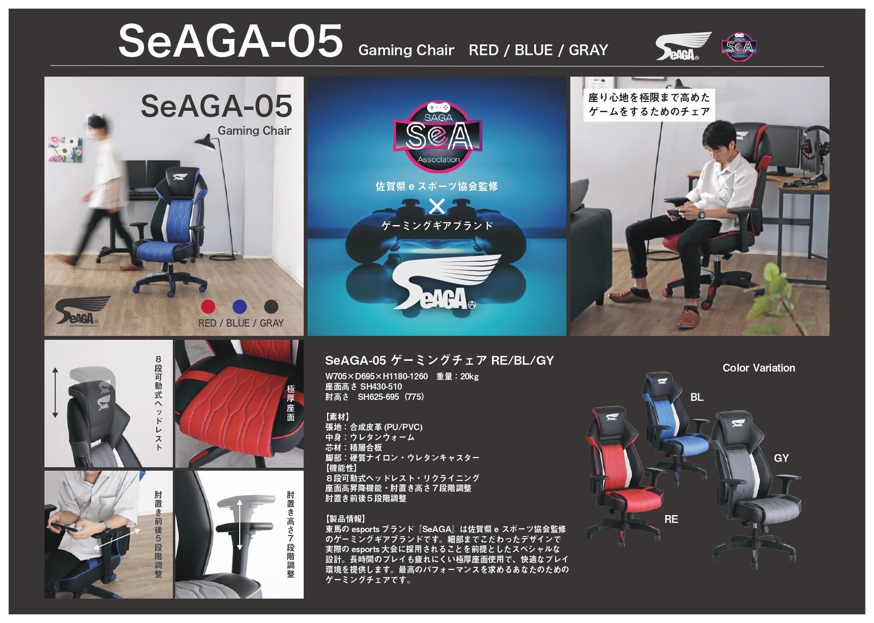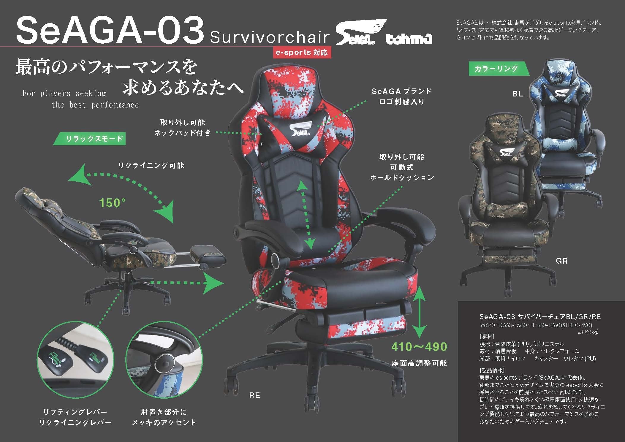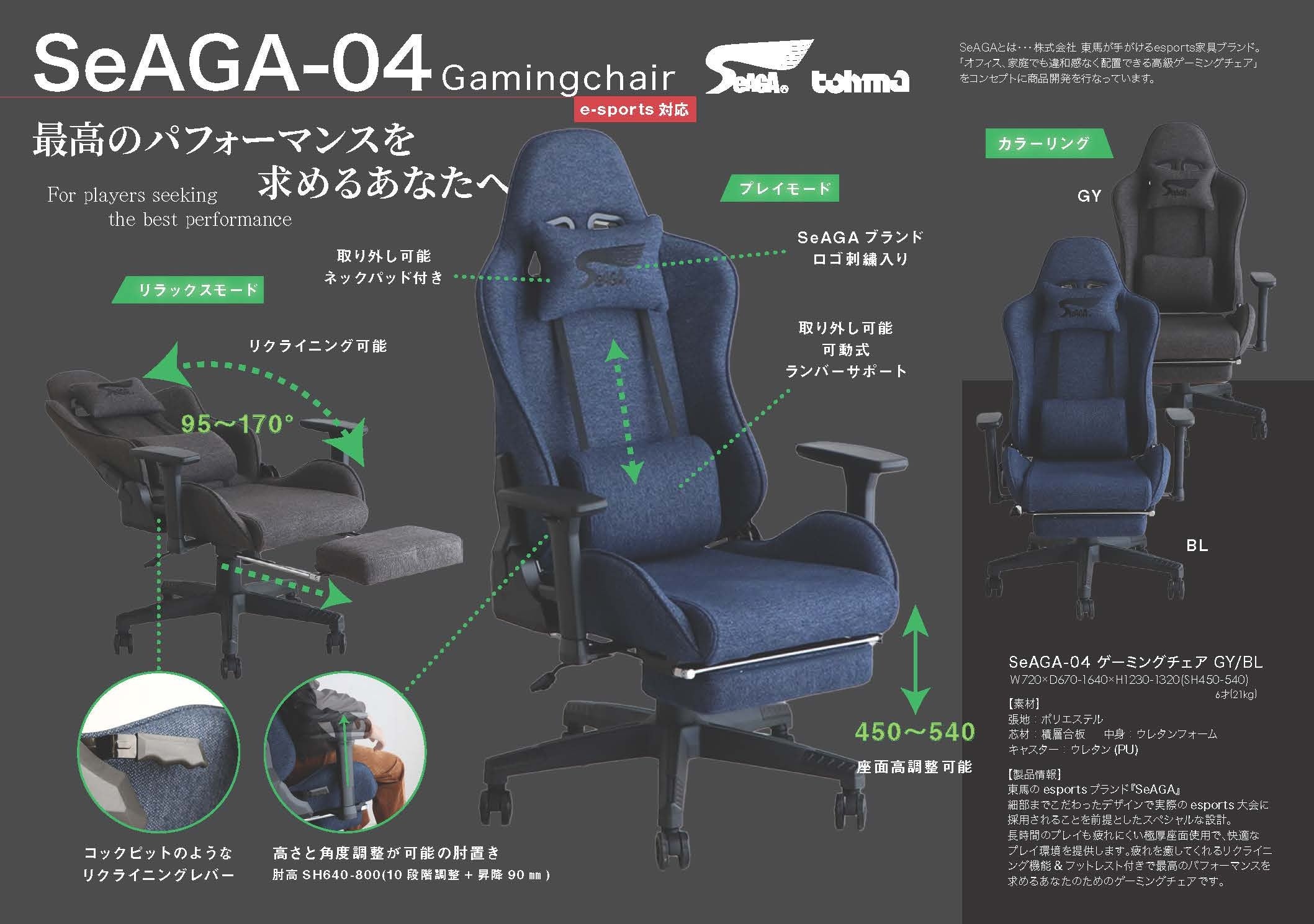 佐賀県e スポーツ協会監修の家具メーカー東馬オリジナルゲーミングブランド『SeAGA』細部までこだわったデザインで実際のe スポーツ大会に採用されることを前提としたスペシャルな設計。長時間のプレイも疲れにくい極厚座面使用で、快適なプレイ環境を提供するゲーミングブランドです。