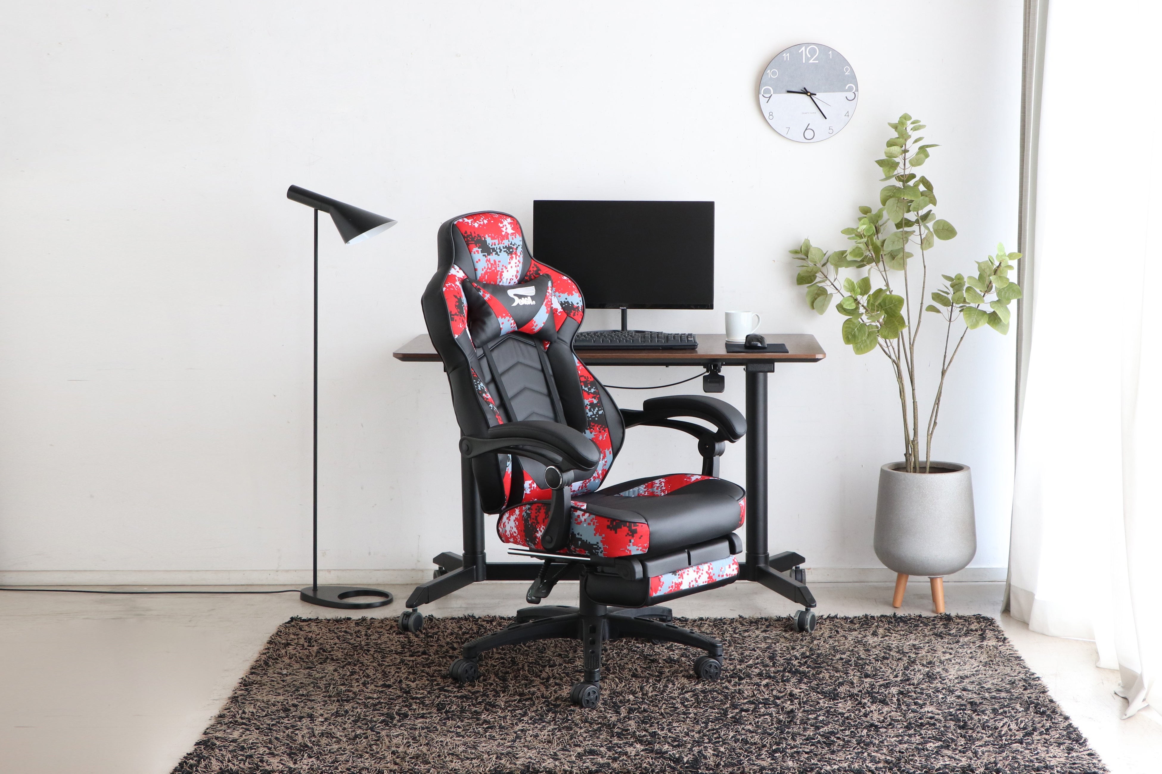 そのコンバットな色合いとデザイン、ランバーサポート付きで快適な座り心地を実現します。長時間のプレイも疲れにくいレタンフォームの極厚座面仕様で、快適なプレイ環境を提供します。座り心地がとても快適です。また、レバー操作で簡単にリクライニングができるため、楽な姿勢でひと休みができ、作業の疲れを癒すことができます。座面下のレバーで最大80mmの座面高さ調節が可能であり、使用者の好みに合わせて調整ができます。快適なプレイ環境を実現するためにこだわり抜かれたデザインと機能性を兼ね備えた、シリーズの中でも非常に人気の高い優れたゲーミングチェアです。
