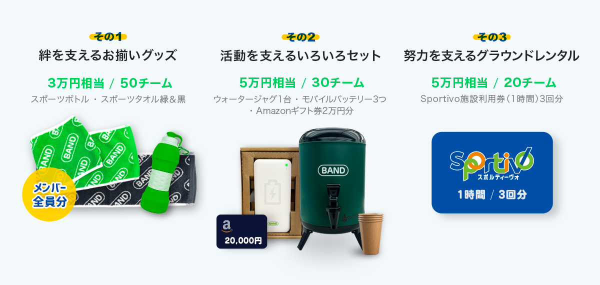 スポーツチームの活動において、あらゆる場面で様々なサポートは欠かせませんが、BANDがチームのスポンサーとなり、全100チームに豪華パッケージや施設利用を提供することで応援するキャンペーンとなります。