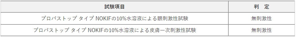 と「眼刺激性試験」・「皮膚一次刺激性試験」の2種類を行うことで、目に入った場合と皮膚についた場合の試験を行った結果。どちらも無刺激性で安全性も高いので、どんな環境でも使用しやすい防カビ剤となっています。