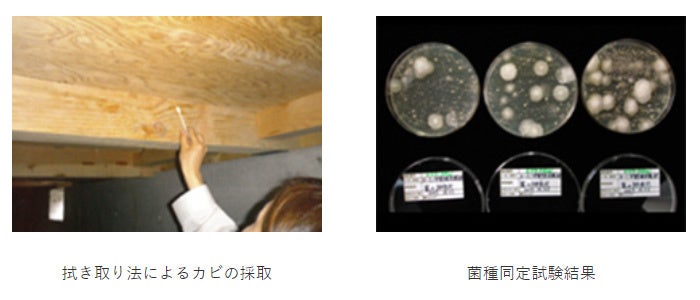 発生しているカビを採取しそれを培養します。その中でも発生量が多かった上位5つの菌種名と疫学上、人体と部材にどういった影響を与えるかを調査&報告いたします。