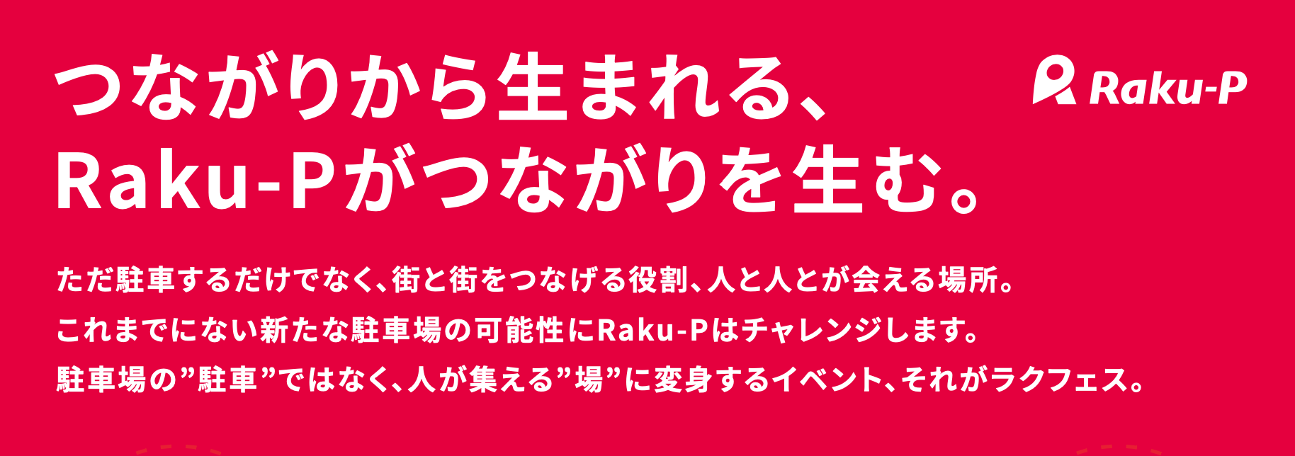 ラクフェスとは、駐車場を人が集える”場”として活用するイベントです。「つながりから生まれる、Raku-Pがつながりを生む。」をテーマに人とのつながりを数珠つなぎしてイベントを創出。ラクフェスを地域のハブとして新たな人と人との出会いを創出するイベントにすることが開催する意図となっています。