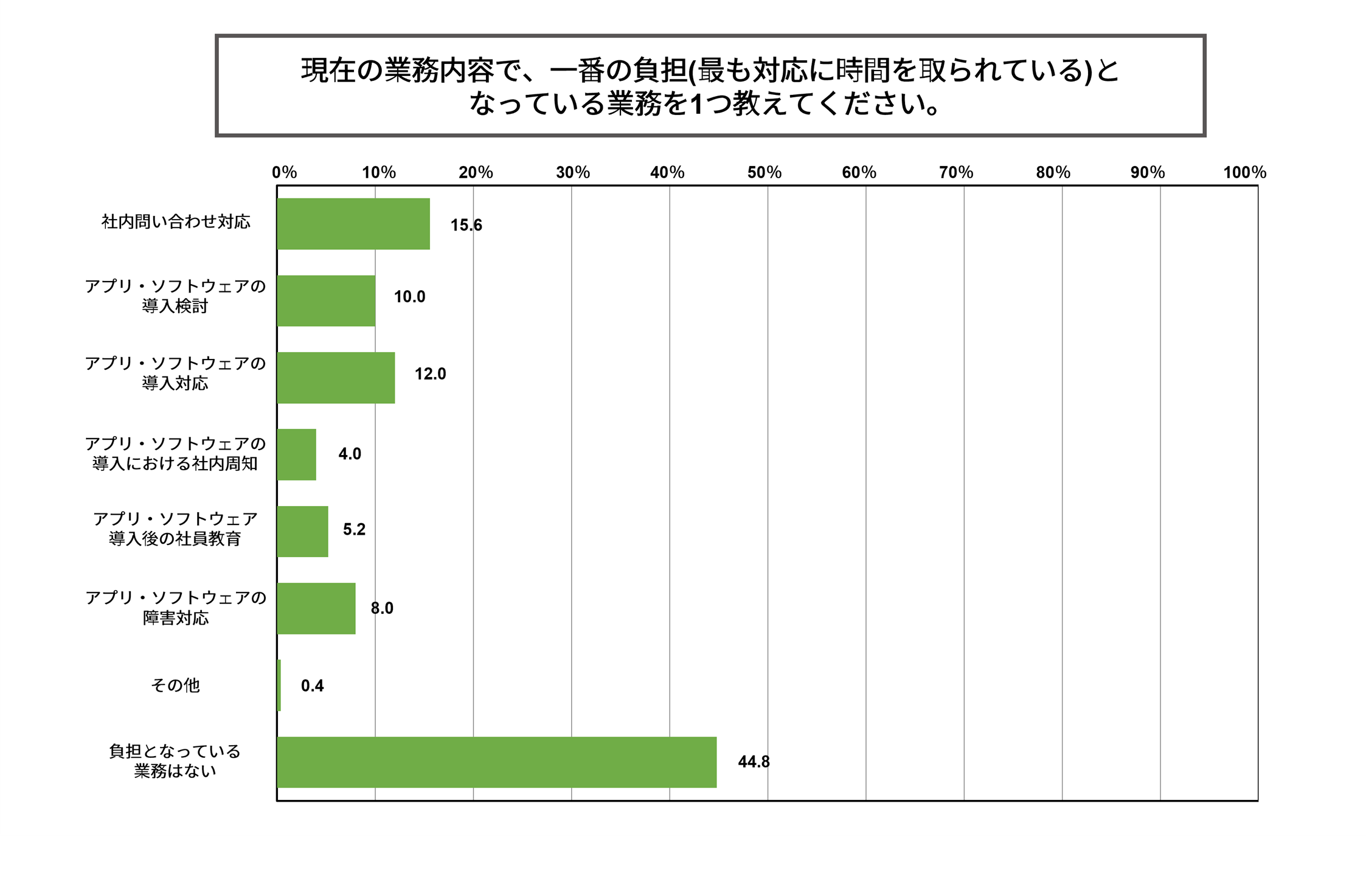 ・情報システム部所属の方のうち、約40%の方がアプリやソフトウェアの導入に関する業務に最も時間がとられて