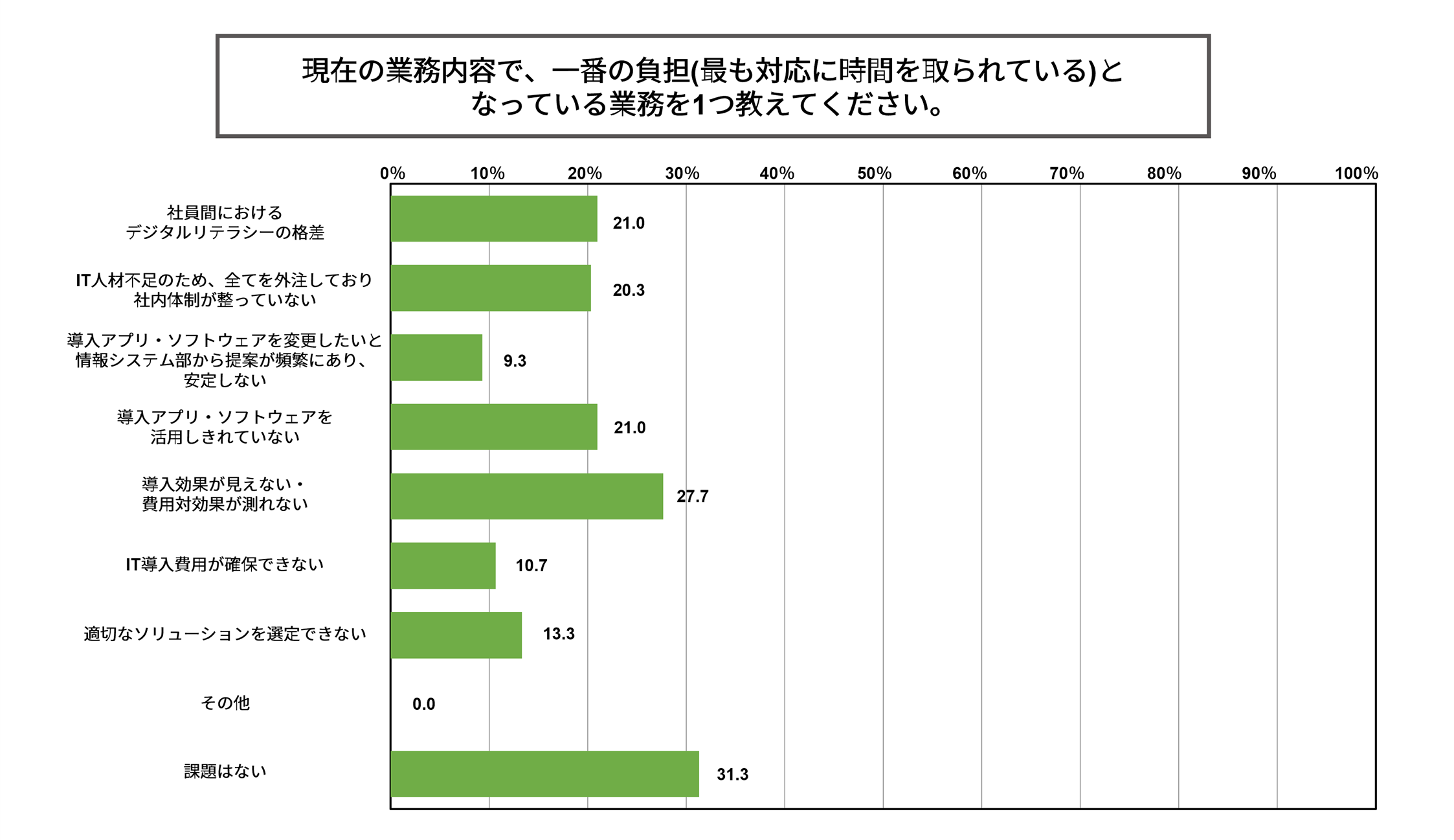 約15%の方が自社の社員からの問い合わせ対応を負担に感じている一方で、約40%の方が新たなアプリやソフトウェア導入時の社内周知(マニュアル作成など)や障害対応を負担に感じていることが分かりました。デジタルアダプションを進めることで、上記のような情報システム部の負担を軽減し、別業務に時間を割くことができ、企業の売上向上に繋がるケースも多いことを伝えられる結果となりました。