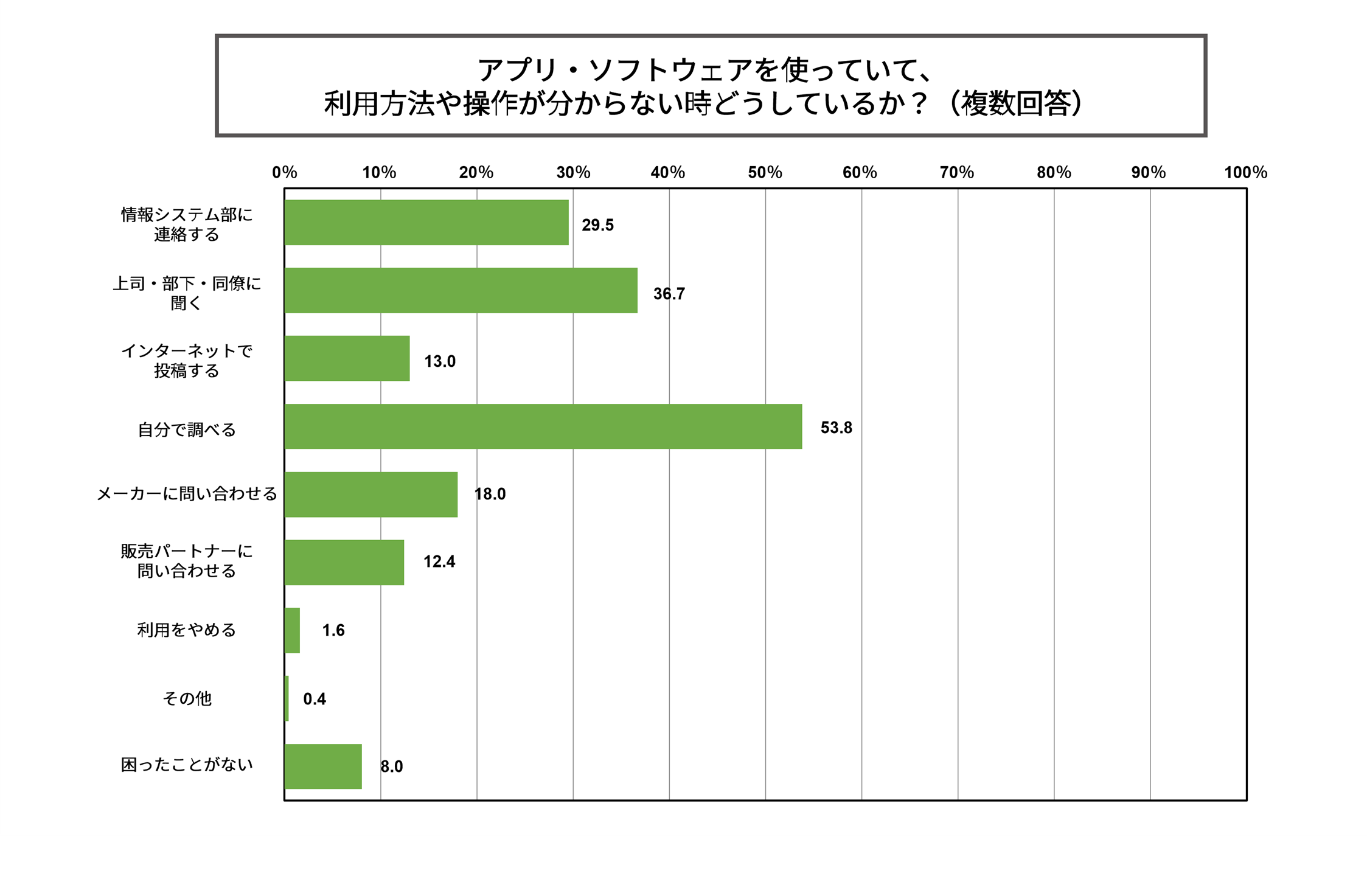 本調査結果から、現在国内の多くの企業で利用されているアプリ・ソフトウェアにおいても、ユーザーにとって使いやすいものとなっているとは言い切れないことが分かりました。情報システム部へ問い合わせをする社員も少なからずいることが分かり、ユーザー目線でのシステム開発、そしてアプリ・ソフトウェア利用時の助けとなるガイド表示が可能となるアプリ・ソフトウェアの必要性も感じられる結果となりました。