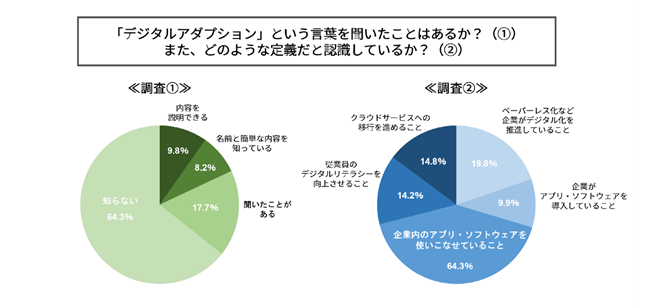 「デジタルアダプション」という言葉が浸透していないこと、さらに本協会が考える意味合いと異なる内容で理解している方も多いことが分かりました。「デジタルアダプション」とは、「デジタルの利活用・定着」を指し、「アプリやソフトフェアの導入」や「ペーパーレス化などを社内で進めること」などは、「デジタルアダプション」を進める手前の段階であると考えています。