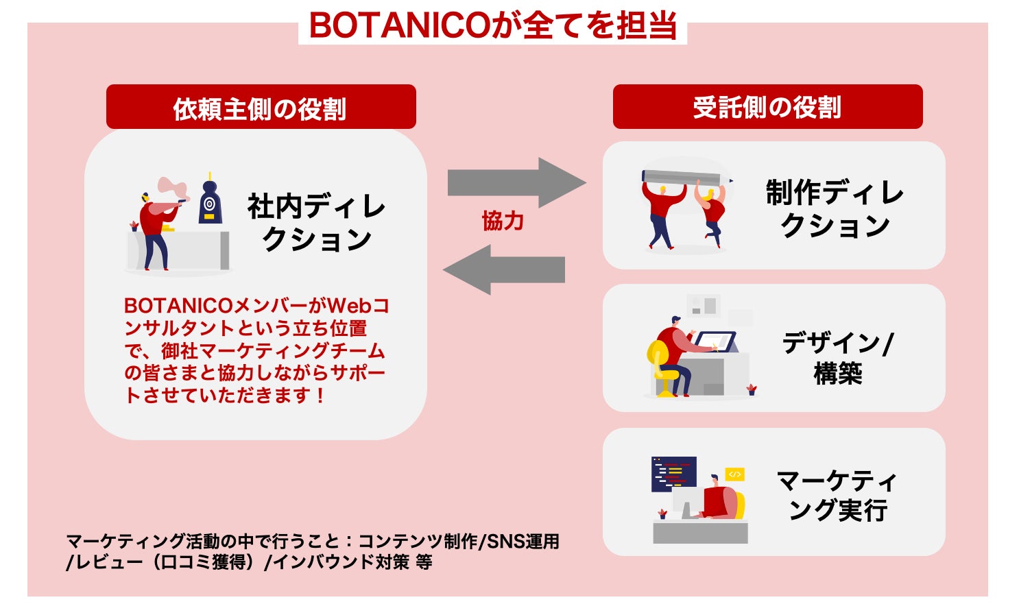 例えばWebサイト制作プロジェクトの場合、Webマーケティングを主軸に制作を行っているBOTANICOだからこそ、一般的な制作会社が請け負う範囲を超えたご提案と対応が可能となり、クライアントの課題と社内体制に合わせて、 スペシャルなプロジェクトチームを作り上げることができます。