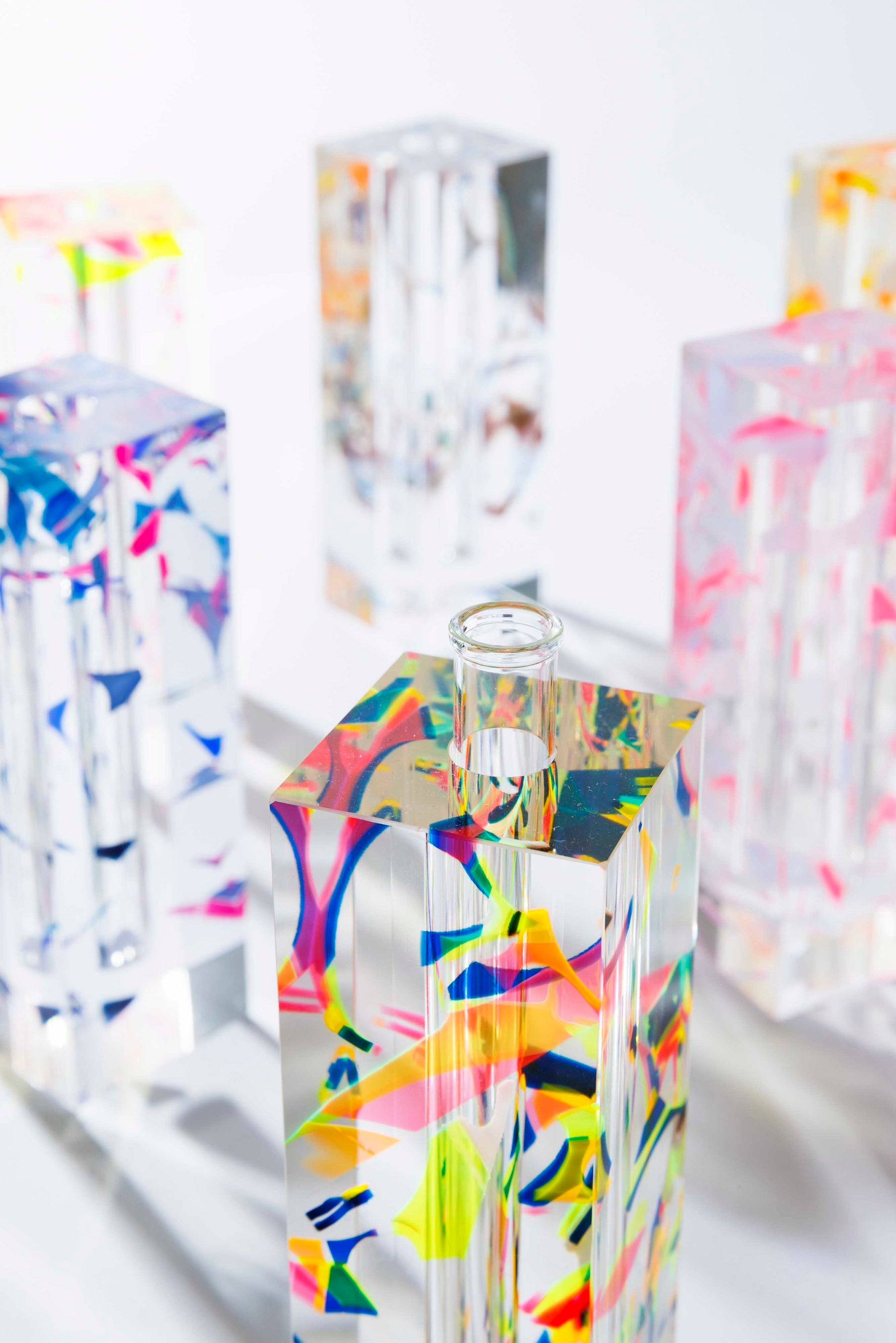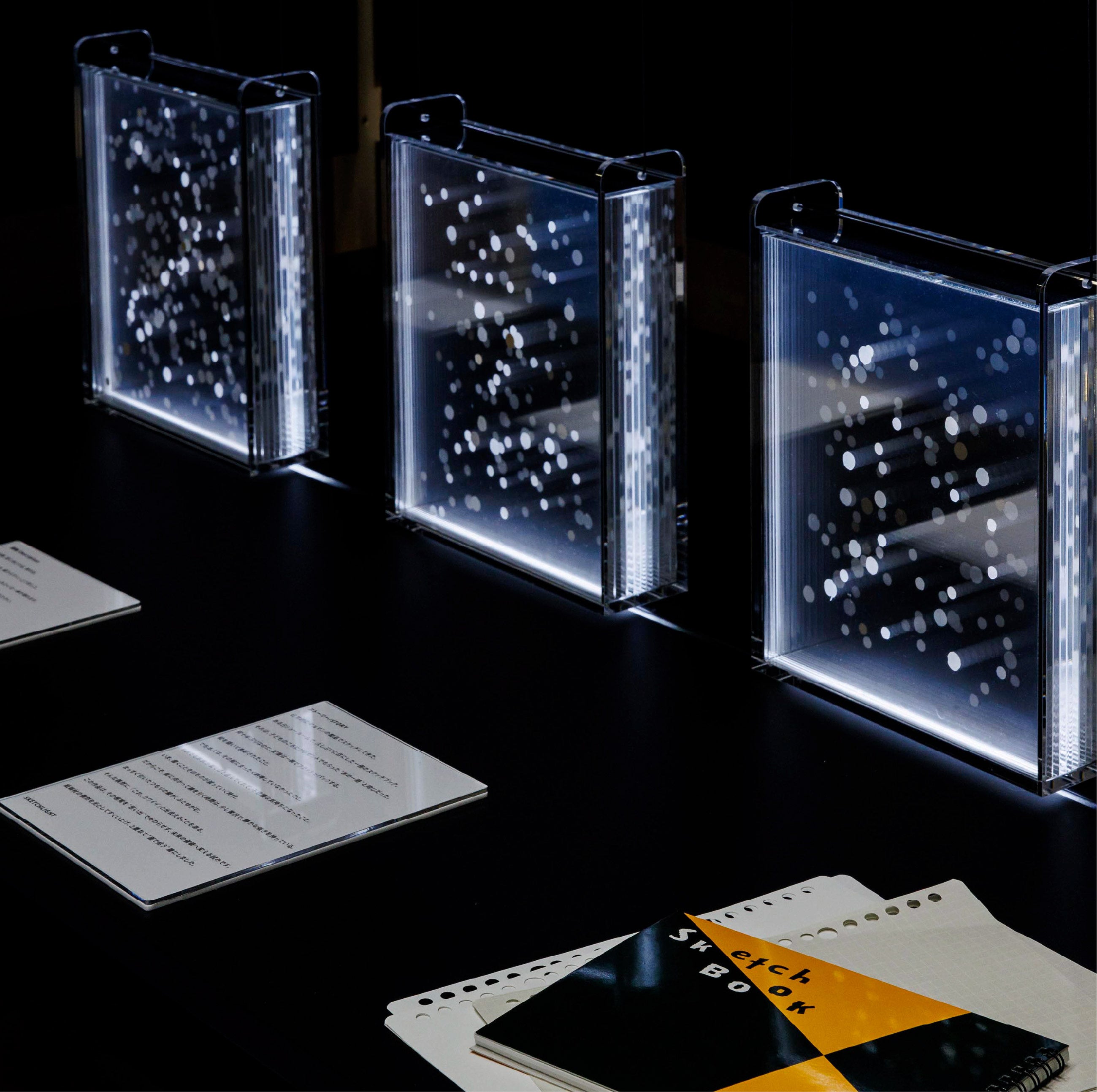 コロナ禍で使用されたアクリルパーテーションをはじめ、さまざまな廃材・端材を活用し、アクセサリー、プロダクト、アート作品、空間演出へと展開しています。