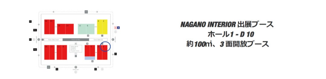 NAGANO INTERIOR はその ホール1 に出展、ホール1と3の境界線となる大きな通路に面し、3 面開放というほぼ独立した贅沢な立地条件のスタンドで、NAGANO INTERIORが誇るアイコン製品を一堂に会します。