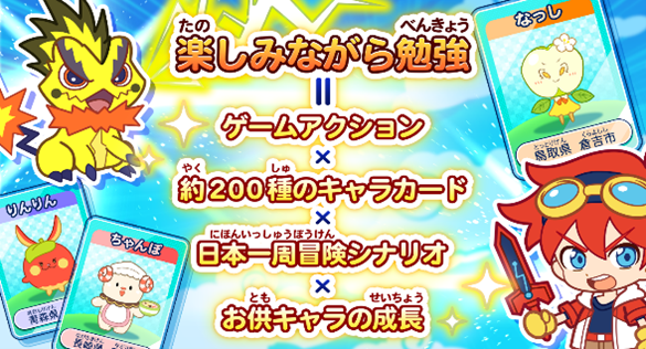 株式会社リリーバレイは、基本プレー無料のモバイルゲーム『popmate』を本日、2022年10月11日(火)から配信を開始したことをお知らせします。本作は、妖怪に捕らえられたゆるキャラを、旅をしながら助けるというストーリーの中、妖怪とのバトルに、漢字、算数、英語の4択クイズを組み込み、ゲーム感覚で学習補助を行うアプリです。約200種類の独特なコメント付きキャラクターカードやお供キャラの成長など、次のステージに進みたくなる要素を組み込みつつ、理論と最新技術を掛け合わせた問題出題で効率良い暗記と学習が可能な仕様となっています。