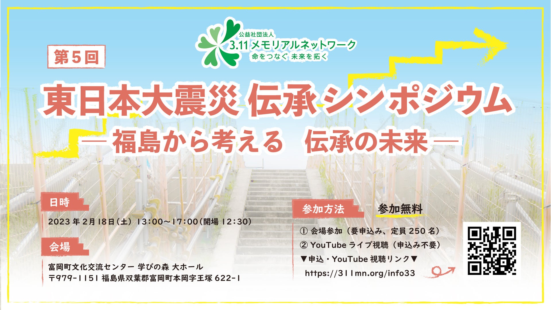 公益社団法人3.11メモリアルネットワーク(所在地:宮城県石巻市、代表理事:武田真一)は、「第5回東日本大震災伝承シンポジウムin富岡」の参加者を募集しています。(現地参加およびオンライン視聴可能)