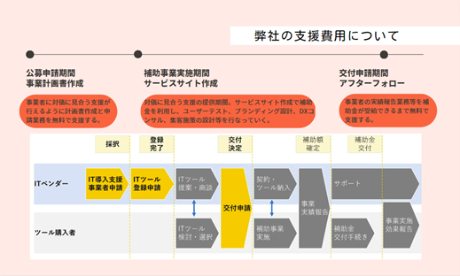 DXの伴走支援をしている強みを生かし、システムの選定や導入支援だけでなく、新規事業に係る広告物(サービスサイト、パンフレット、動画、写真等)の作成及び媒体掲載、展示会出展(海外展示会を含む)、営業代行、マーケティングツール活用等の支援を行います。弊社の他のサービスを申し込んでいただくことで、申請サポートを実質0円で利用することが可能です。