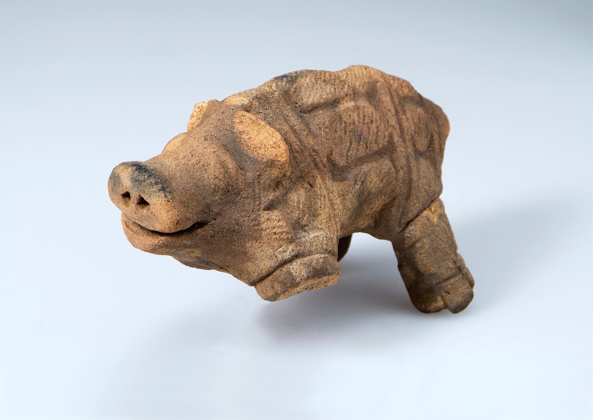 全体の形が分かるまま残された貴重な資料です。イノシシの特徴である大きな鼻や背中の盛り上がり、爪先立ちの脚部などが上手く表現され、微笑んでいるように見えるのは市原市内から出土する動物形土製品の共通した特徴です。