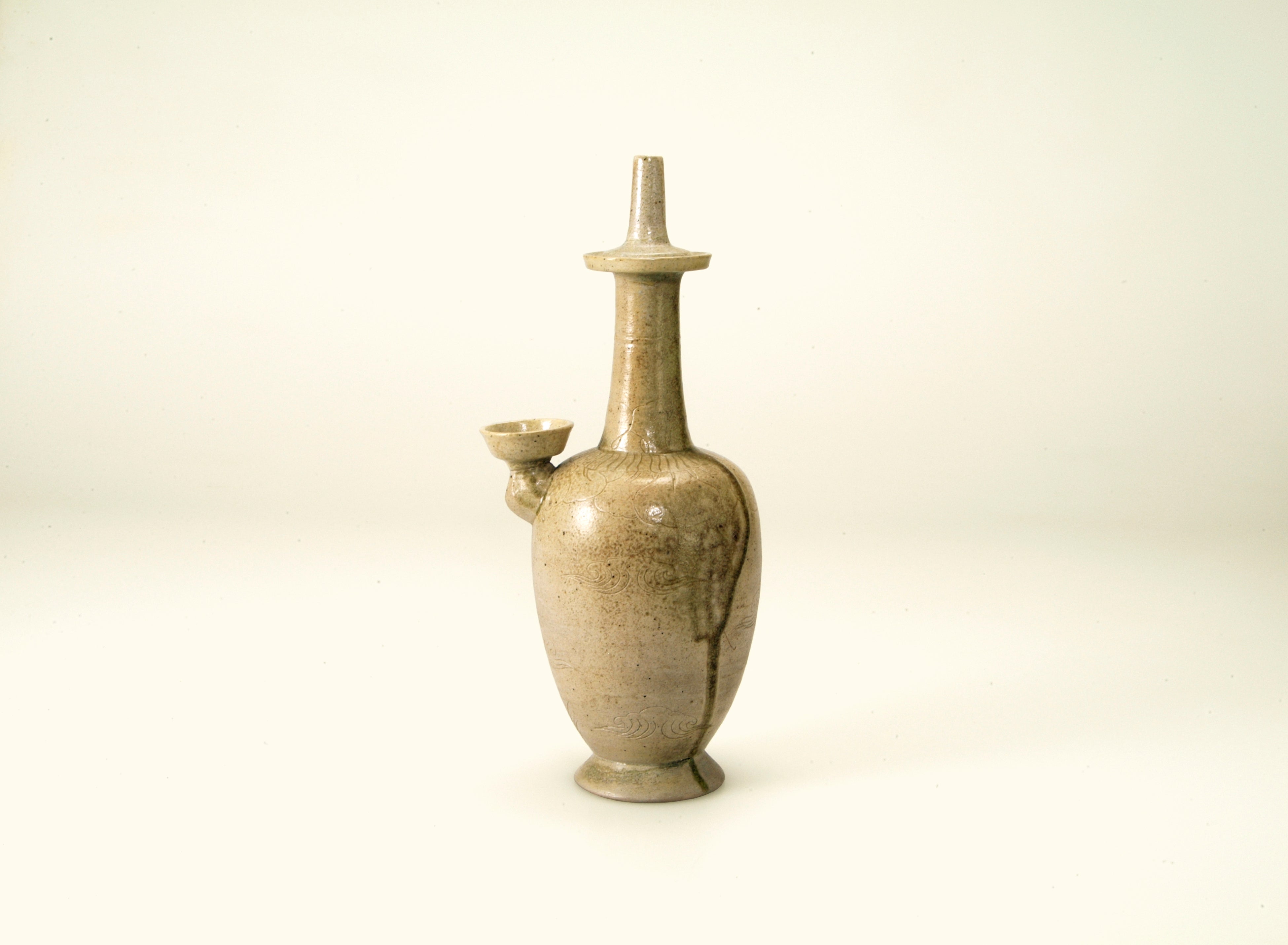 猿投窯(現在の愛知県)で焼かれた灰釉陶器で、器面に花・雲・草の文様を陰刻した浄瓶です。浄瓶は、水瓶の一種で元来は僧侶の日常品の一つであったものが、仏前供具として使用されるようになったものと考えられます。