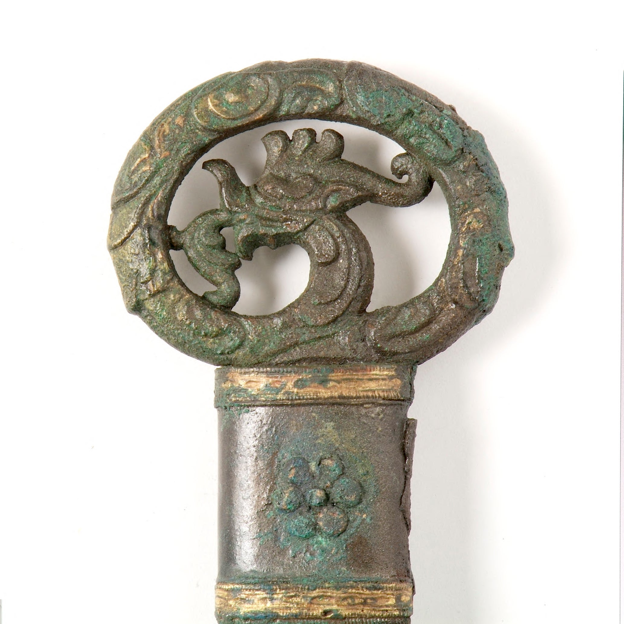 山王山古墳出土の金銀装単龍環頭大刀は、環頭部の楕円環が龍の胴体と脚を忠実に描いており、楕円環の胴体からのびた単独の龍が、火炎を放射している様子が鋳造されています。このように精巧な作りの環頭大刀で、環頭から鞘尻まで良好な保存状態で出土した例は国内では類例が乏しく、銀線巻きの柄は、当時の装飾大刀の中でも格上の製品だったと考えられます。山王山古墳の被葬者がいかに有力な人物だったかを物語る重要な資料と言えます。