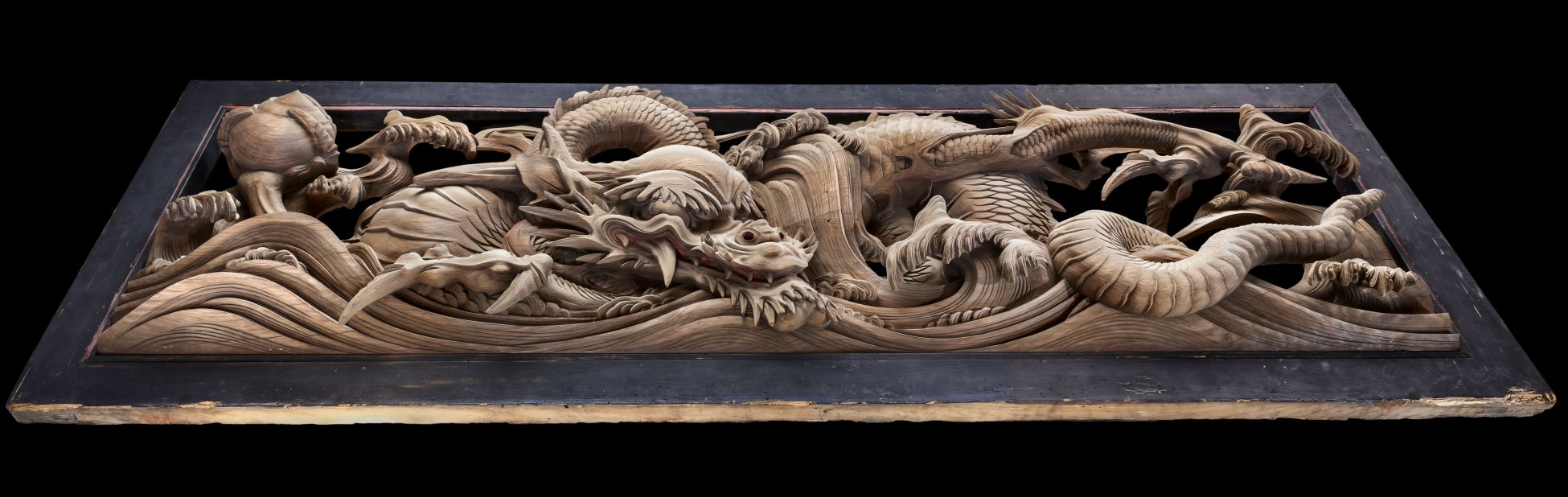 武志伊八郎信由(たけしいはちろうのぶよし)(初代伊八)が製作した欄間彫刻です。初代伊八は、安房国長狭郡下打墨村(ながさんぐんしもうっつみむら)(現、鴨川市)の出身で、上総や安房に多くの彫刻を残しています。波に代表される繊細な彫りと大胆な構図、ボリュームのある立体表現を得意とし「波の伊八」と称されました。この彫刻には製作年代が記されていませんが、光厳寺の記録から文化3年(1806)以前の製作と分かりました。