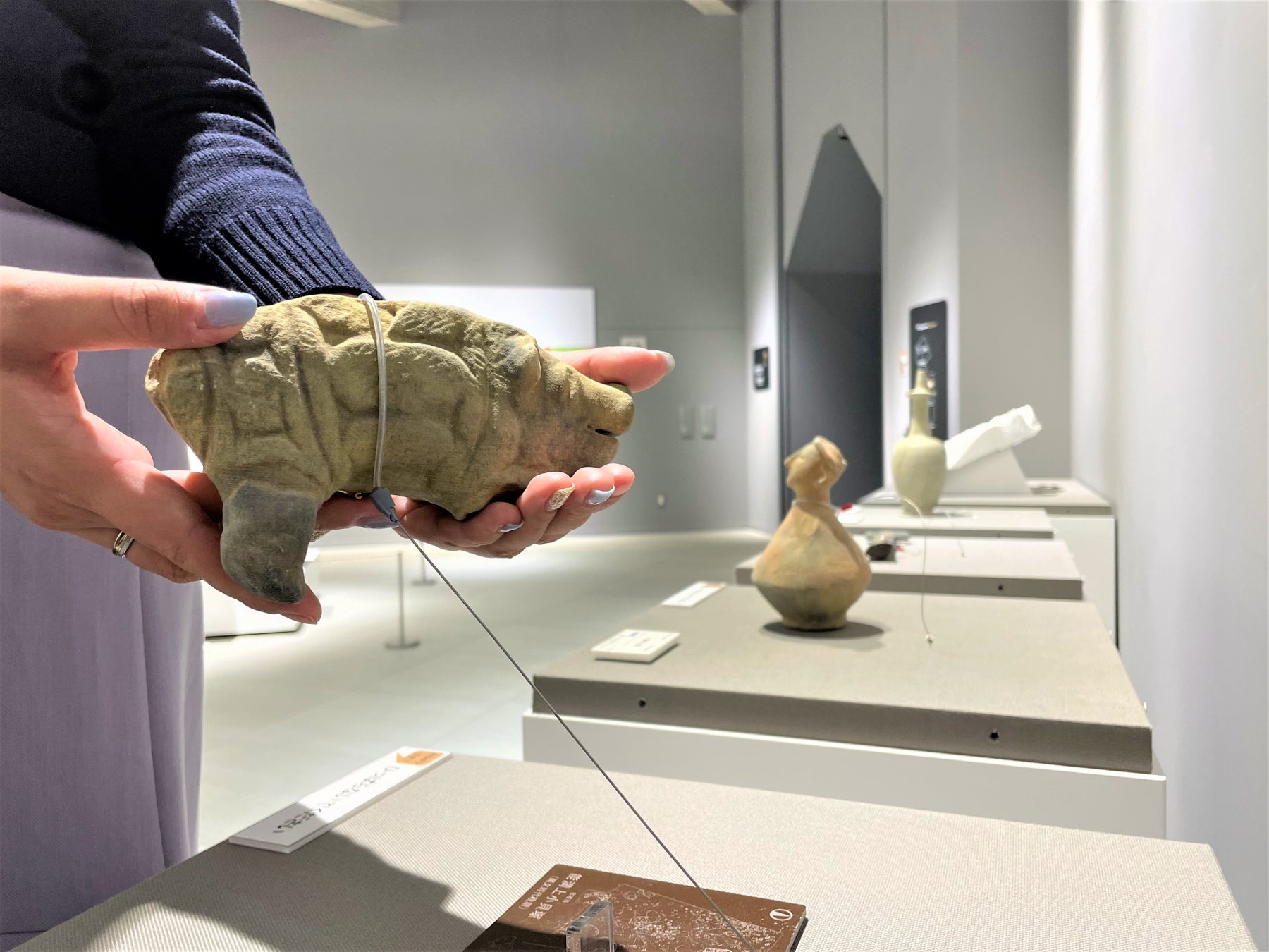 この度、「触れる展示」の第一弾として、縄文時代の「イノシシ形土製品」、弥生時代の「人面付土器」、古墳時代の「金銀装単龍環頭大刀(きんぎんそうたんりゅうかんとうたち)」の柄部分、平安時代の「灰釉花文浄瓶(かいゆうかもんじょうへい)」、江戸時代の「光厳寺(こうごうんじ)本堂の欄間彫刻「波に龍」を展示しています。