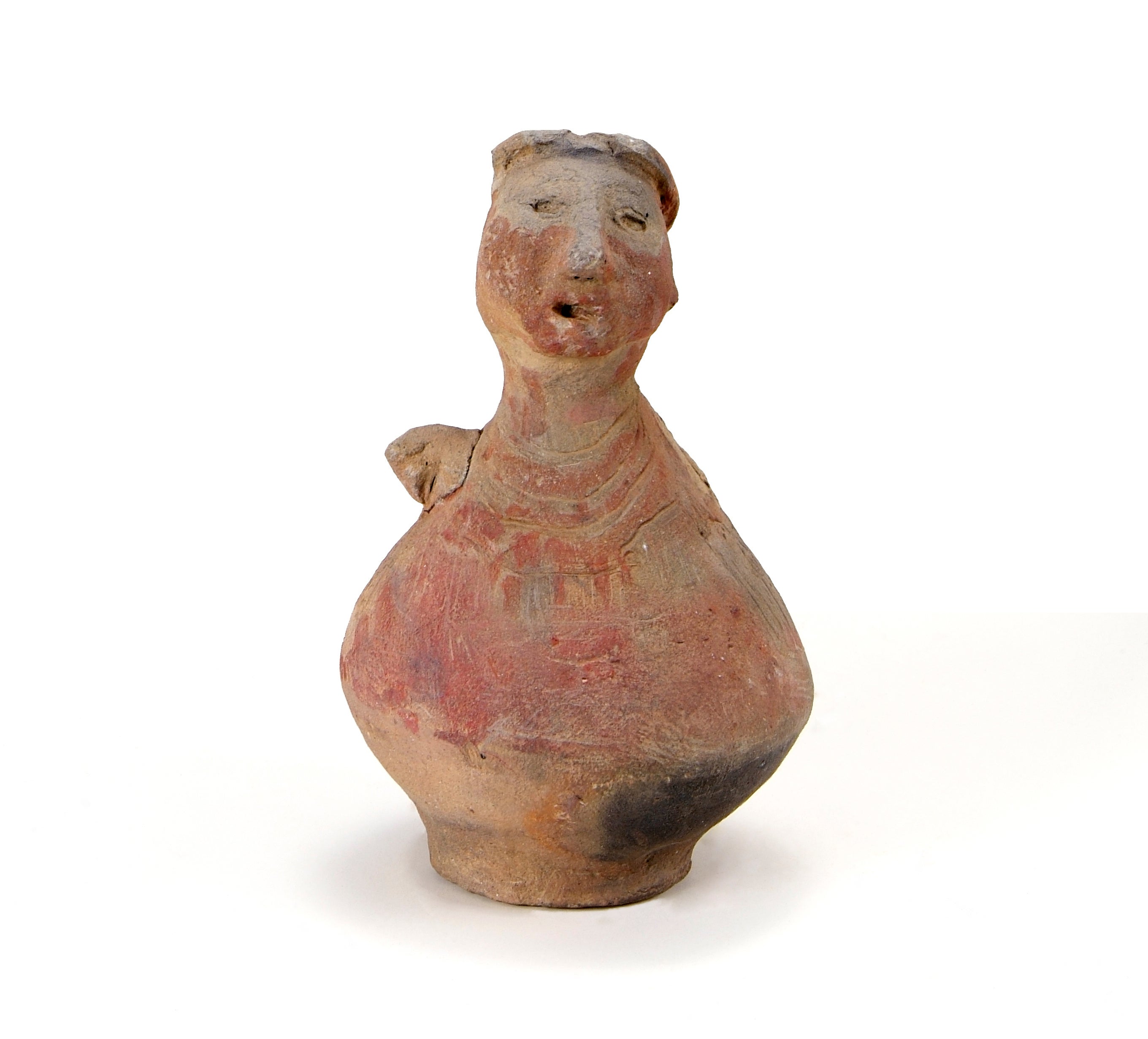 人の形をした土器で、弥生時代の人面土器は、縄文時代の終わり頃に初生児骨や歯が納められた容器形土偶の系譜上に作られたものと考えられています。三嶋台遺跡の例は、高さ18センチメートルと小型なものの、穏やかに空を仰ぐような顔の表情や保存状態の良さ、手を表現している珍しい作例として、弥生時代の人面付土器を代表する遺物と言えます。