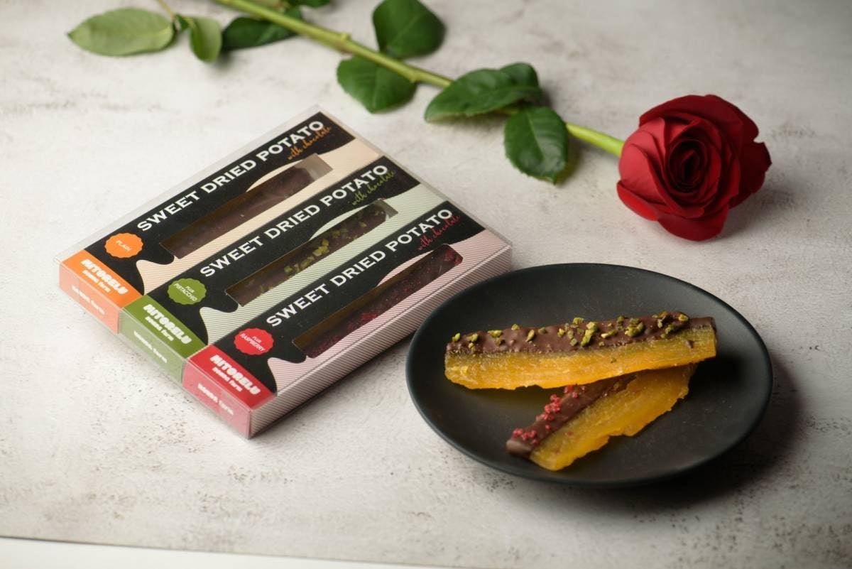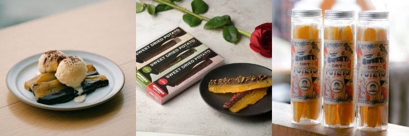 また、ギフトとして丸管に入ったほしいもや、蔵出し紅はるかを加工した生干し芋をビターチョコレートでコーティングし、ピスタチオやラズベリーをトッピングした、新感覚のちょっぴり着飾ったほしいもを、茨城ギフトとして販売します。