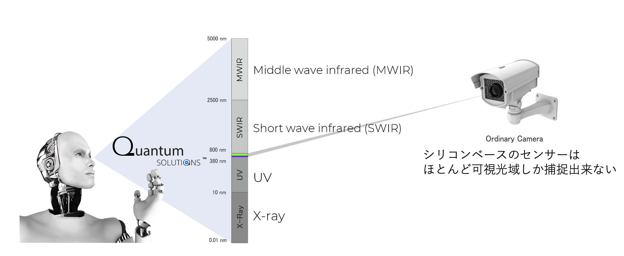 クアンタムソリューションズの量子ドット技術はこのような課題のために開発されたものであり、シリコンCMOS上に量子ドット層の素子を形成するだけで幅広い波長域の情報捕捉を可能とする。すなわち、量子ドットによる高機能イメージセンサーとは、可視光外の短波長〜中波長赤外(SWIR〜MWIR)で捉えたモノクロな画像情報をCMOS素子が捉えた可視光域の画像情報と合成し、ダイナミックレンジの広い撮像を可能とする仕組みである。