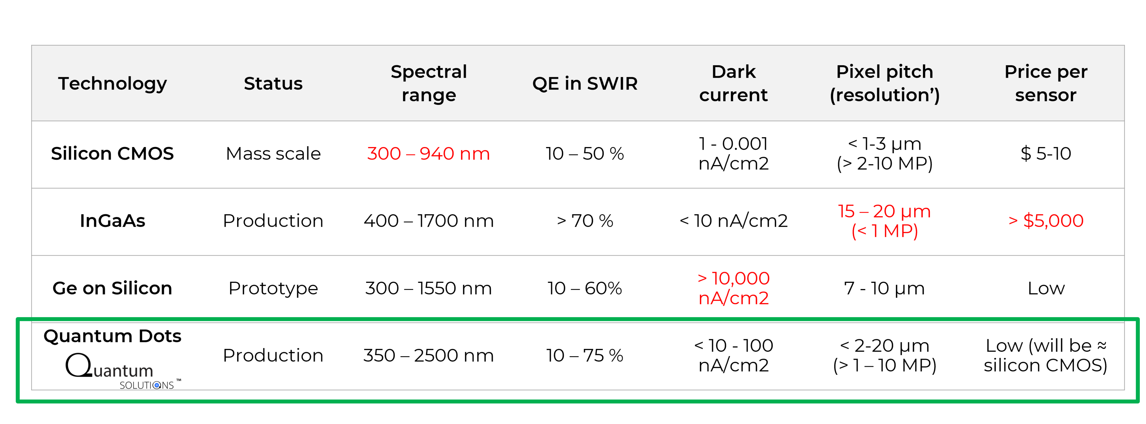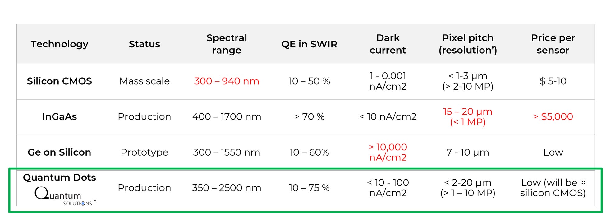 同社は世界の主要な研究機関であるサウジアラビアのKAUST (アブドラ王立科学技術大学) から2017 年に設立された企業であり、現在は本社を英国サウザンプトンに置いて、多くの半導体・イメージセンサー企業ならびにimec(ベルギー)などの研究開発機関と世界規模のパートナーシップを築いている。さらには、ノキア社よりスピンアウトした英Emberion社 (www.emberion.com) などとの戦略的協業関係によって、量子ドット技術を用いたイメージセンサー/カメラにおいて世界初の商用化・製品化に成功している唯一の企業である。同社の他にセンサー向け実用製品を出荷している企業は存在しない。