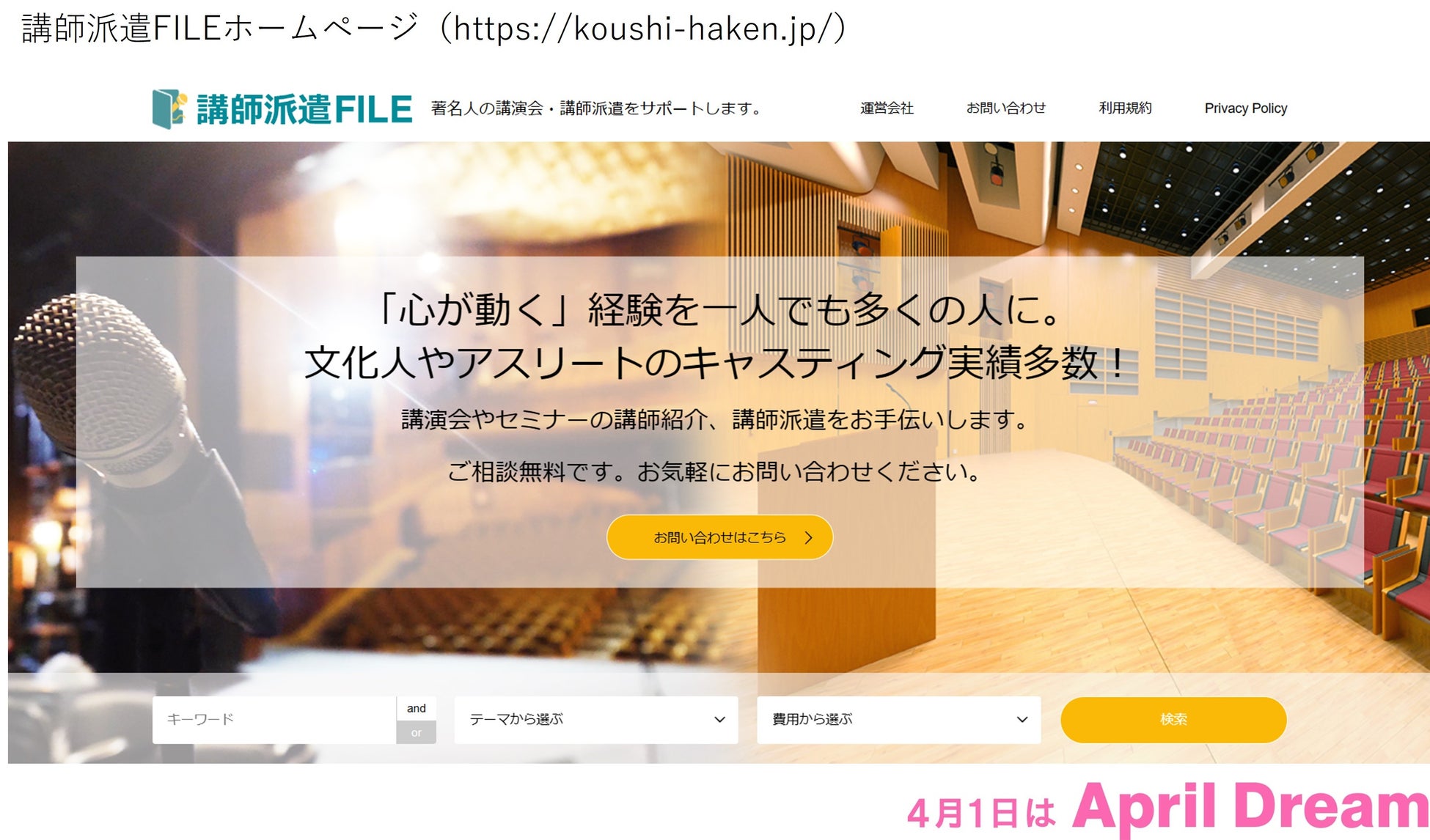著名人、専門家をお招きした講演会をお考えのみなさまに、感動をお約束する講師のキャスティングを目指します。弊社は、4月1日を夢を発信する日にしようとするApril Dreamに賛同しています。