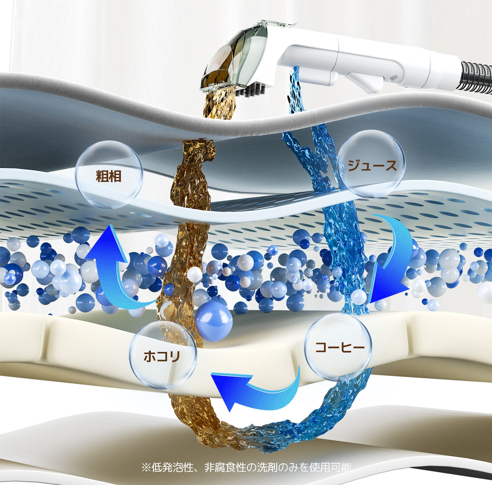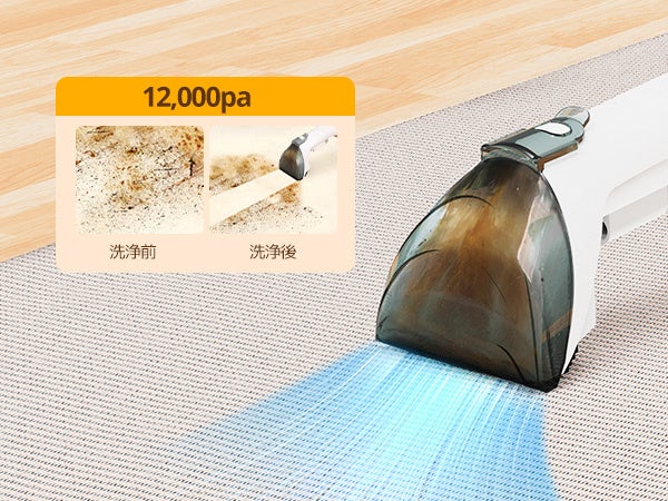 強力洗浄の理由は水と一緒に汚れを吸い込む!450wの純銅製モーターを搭載し、最大吸引力は12000paに達します。水で汚れを浮かせながら、ブラシでこすることで一気に吸い取ります。約60℃まで温水対応可能、しつこい汚れやシミなども楽に掃除でき。