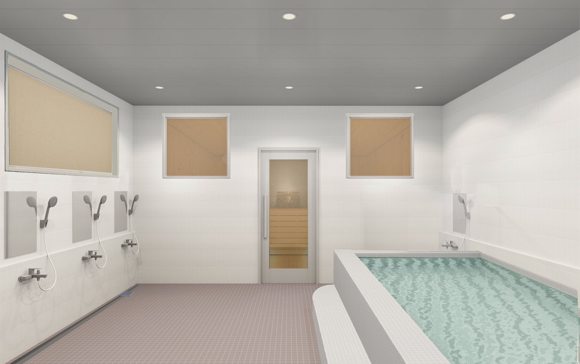 開放感のある設計で、収容人数100名と高温(常時100℃程度)サウナ室としては世界最大級※を誇ります。また、ベンチは胡坐でも問題ない奥行きにて設計しており、ゆったり広々としたサウナタイムを、お楽しみ頂けます。