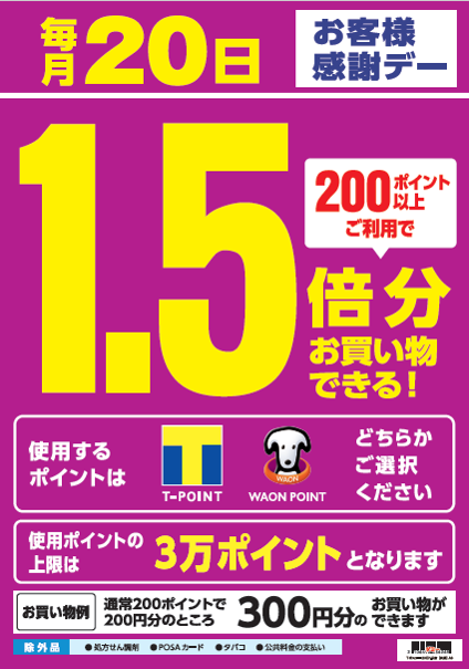 TポイントかWAON POINTを、200ポイント以上ご利用頂くと、通常の1.5倍分のお買い物ができます。