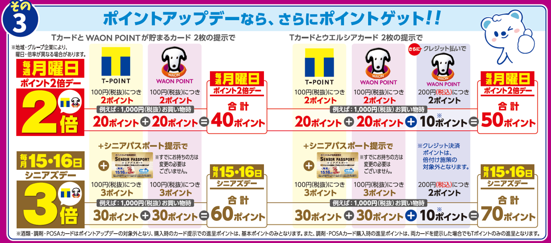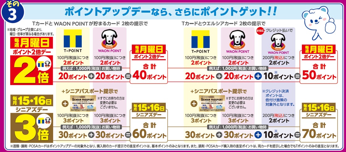 ※酒類・調剤・POSAカードはポイントアップデーの対象外となり、購入時のカード提示での進呈ポイントは、基本ポイントのみとなります。また、調剤・POSAカード購入時の進呈ポイントは、シニアパスポートを提示した場合でもTポイントのみの進呈となります。