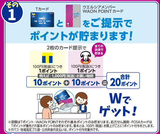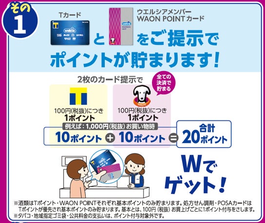 ウエルシアメンバーにご登録の上、TカードとWAON POINTカードの両方を提示いただくことで、それぞれ100円(税抜)につき1ポイントが貯まります。