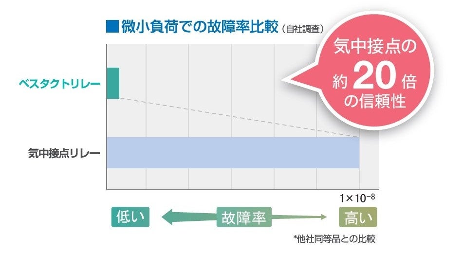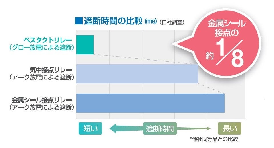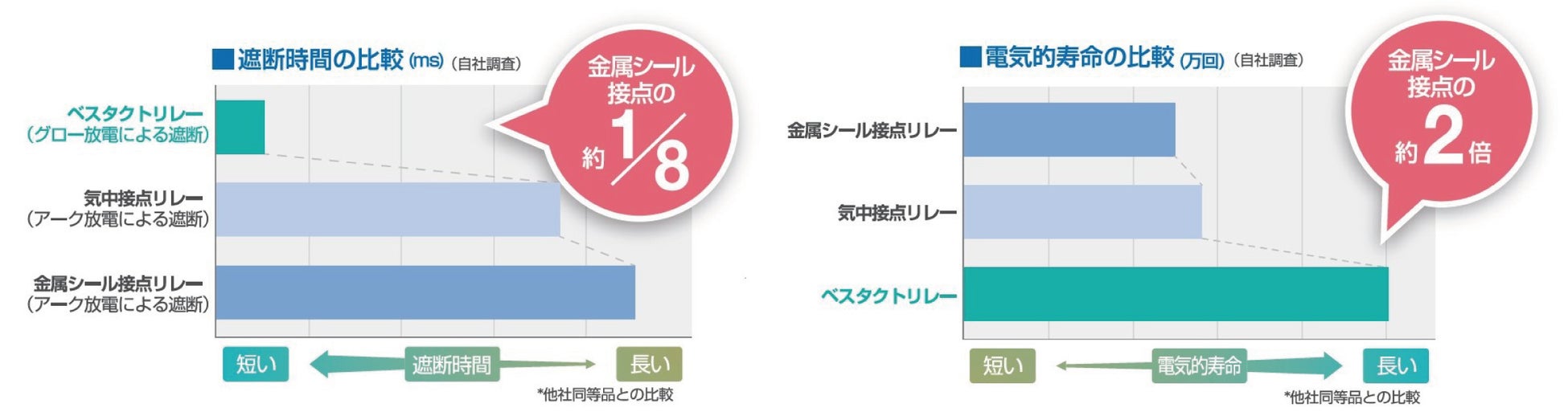 ベスタクトは接点が遮断する(OFFする)際に、短い遮断時間を実現しているため、接点部の消耗を防いでいます。リレーが接点を遮断する際には放電が発生しますが、ベスタクトリレーはグロー放電(接点部を短時間で均等に消耗する放電)で遮断するのに対して、気中接点リレーや金属シール接点リレーは、アーク放電(接点部を長時間で極部的に激しく消耗する放電)で遮断しています。そのため、ベスタクトリレーは気中接点リレーや金属シール接点リレーに比べて電気的寿命が長くなっています。