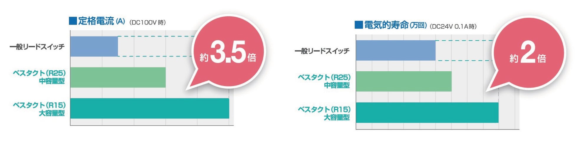 ベスタクトは特殊な接点構造と接点材料によりー般のリードスイッチよりも大きい定格電流を実現しています。これにより直接制御できる機器の幅が広がるため、回路内の余分な保護回路や小型の接触器を削減し、回路設計者の設計の自由度を高めることに繋がります。またベスタクトの特殊な接点は、接点部の消耗を防ぐ効果も生むため、電気的寿命が長くなります。長寿命なリレーを実現し、リレーの交換頻度を減らすことができます。