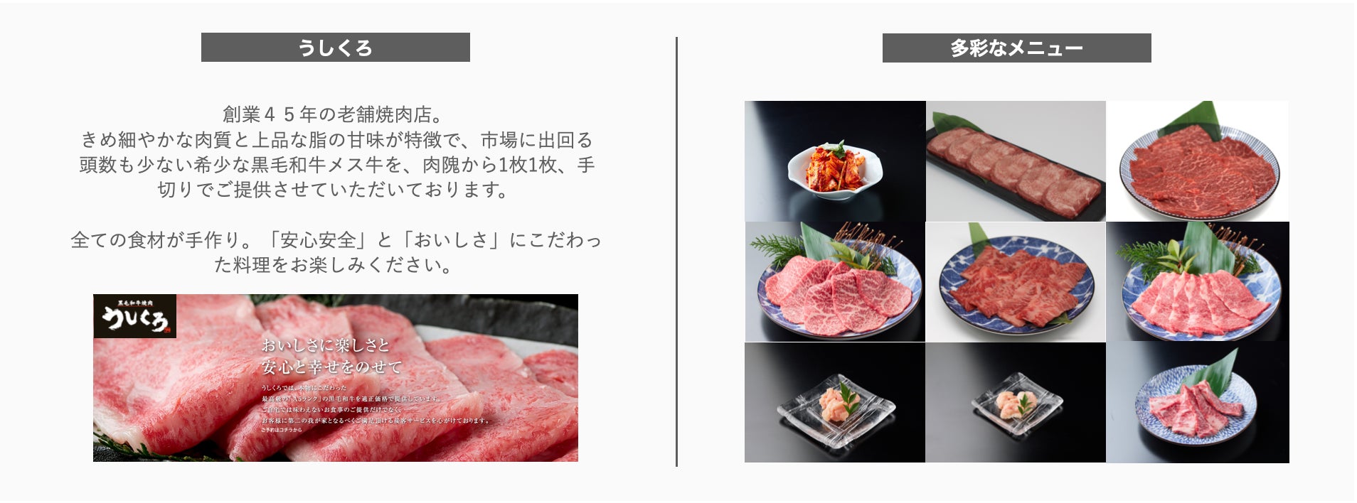ザ・BBQクラブのライセンス契約を結ぶことで、独自ルートでしか手に入らない有名焼肉店のタレ・食材を会員の方のみご購入いただくことが可能です。これにより焼肉業態についてのノウハウや、新メニュー導入による仕入れや仕込み問題は全て解決できます。第一弾は都内に7店舗展開する焼肉店「うしくろ」。高品質な和牛を適正な価格でご提供いたします。