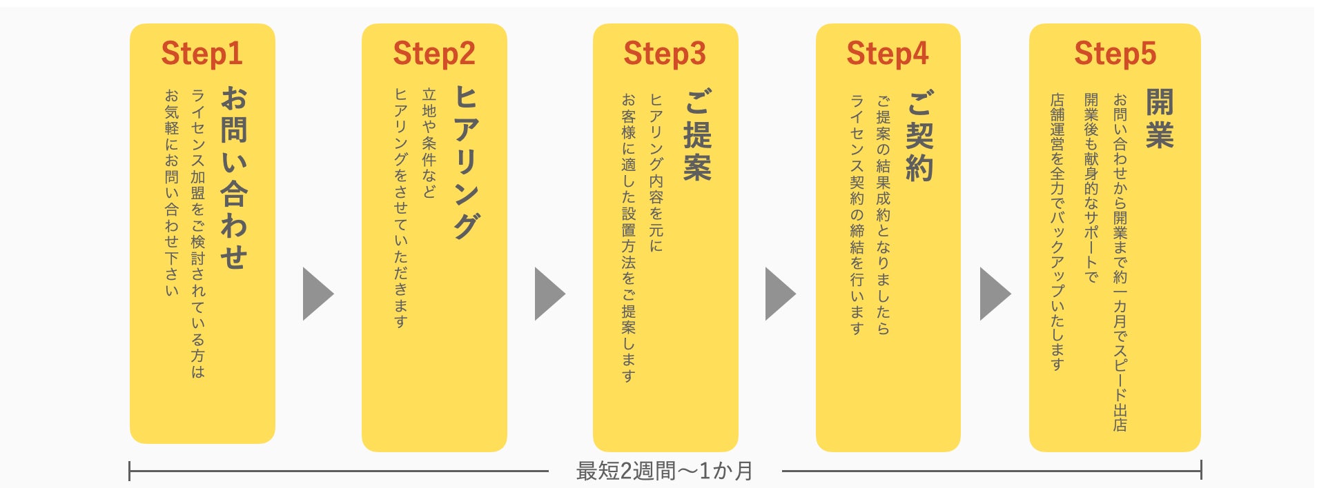 契約から最短2週間、お問い合わせから約1か月で開業が可能です。開業ノウハウ豊富なスタッフがサポートいたします。