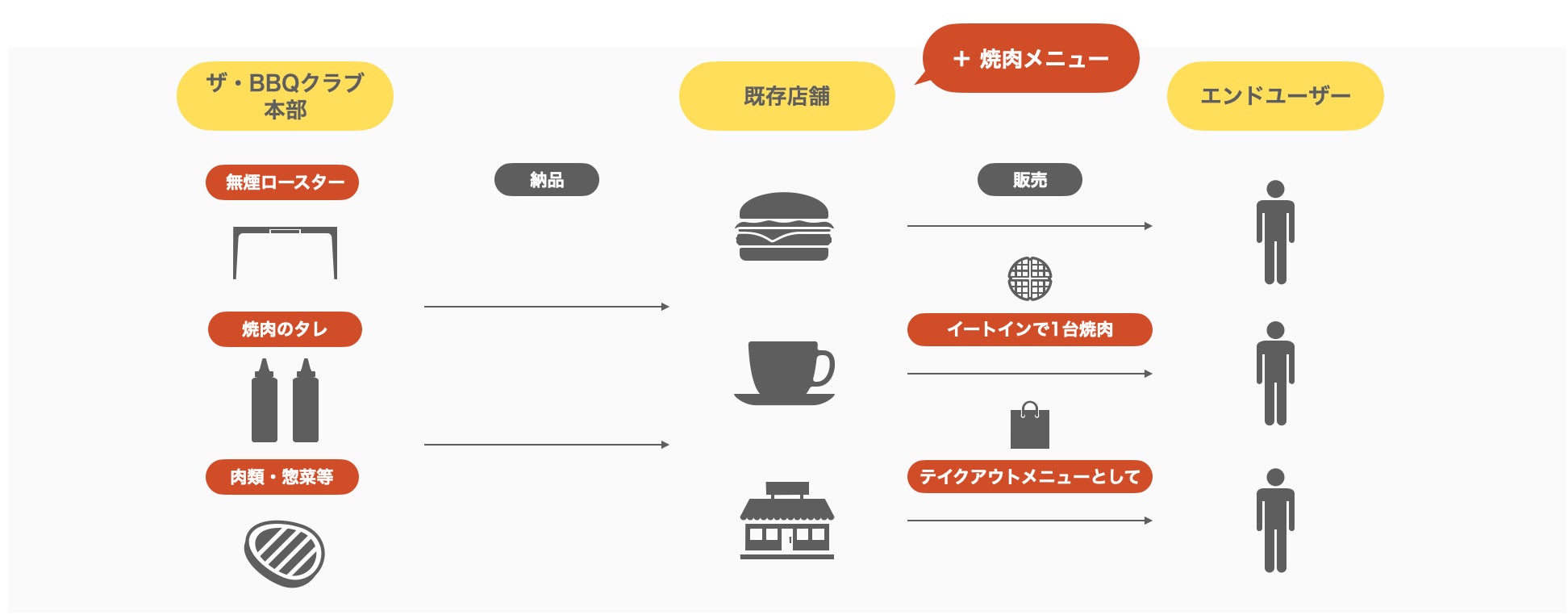 店舗内に焼肉店を設置することで、焼肉目的の新規顧客獲得が可能となります。既存のお客様に対しても既存メニューの他に「焼肉」という選択肢を与えることができるため、リピート率の向上も期待できます。