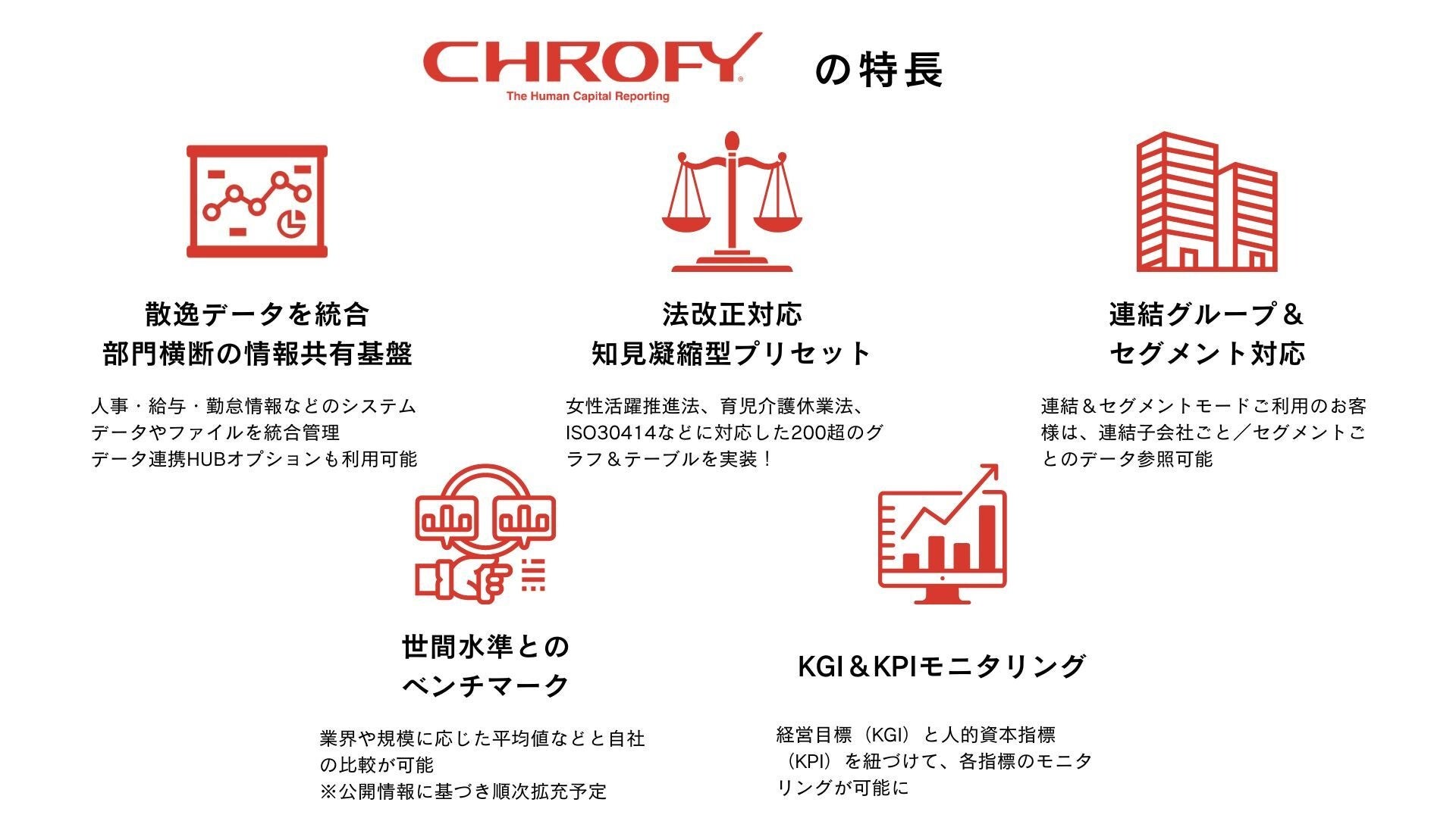 「CHROFY」は、企業内に散逸する勤怠/給与/人事評価など複数の人事関連データをもとにして統合データベースを構築し、それを可視化するサービスです。