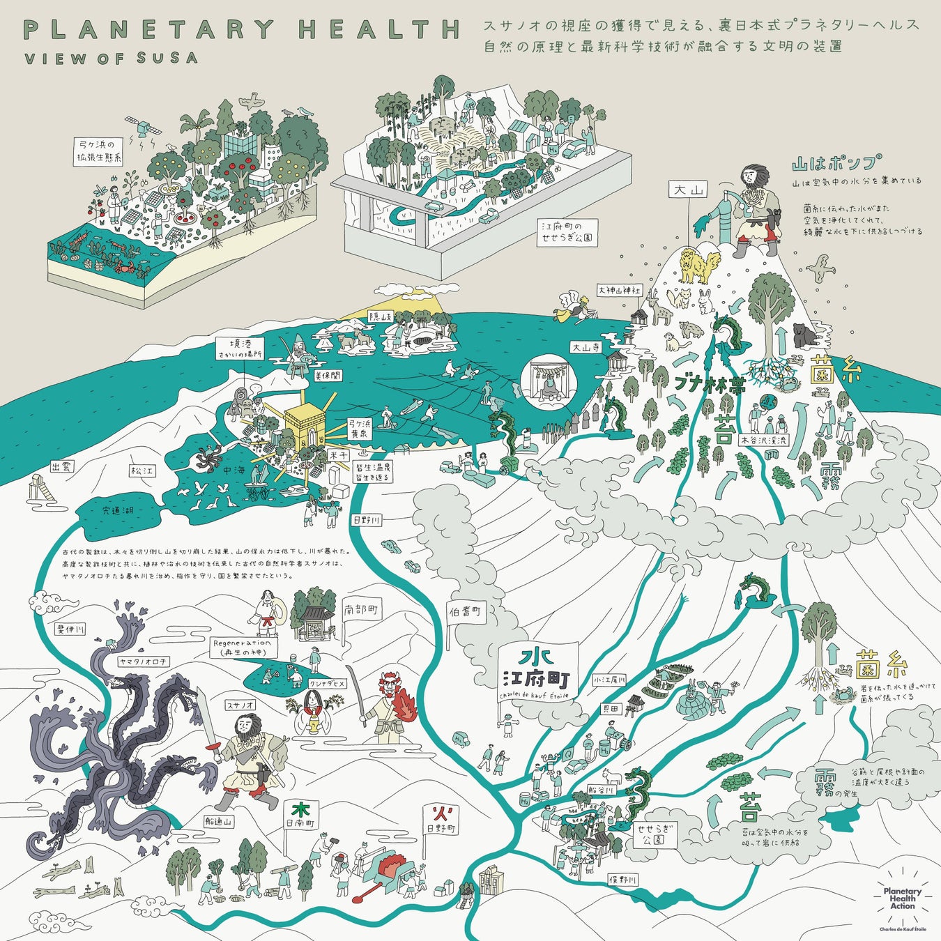 プラネタリーヘルス・ツーリズムでは、日本創生の神話・古事記の舞台である山陰エリアにおいて、古代出雲國式のプラネタリーヘルスを風呂敷マップにし、古代から積層する土地の歴史文化・気候風土を踏まえながら、自然の原理と最新の科学技術により自然と共存共栄する文明をこの地に発展させた古代の神「素戔嗚(スサノオ)の視座を獲得する」ことをテーマに越境人材を育てる最短3日間のプログラムを構築しています。