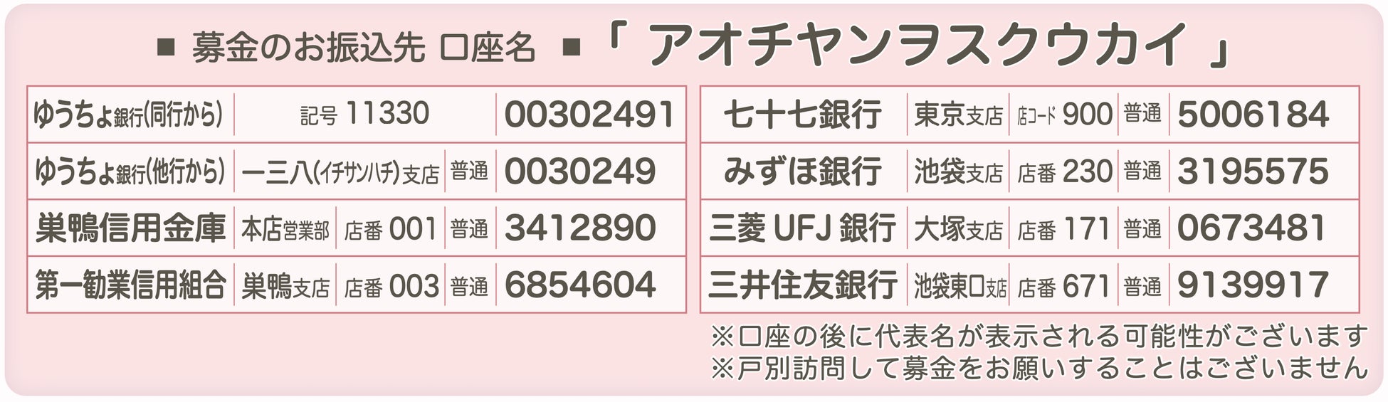 - ホームページURL: https://ao-sukuukai.jp (「あおちゃんを救う会」で検索)