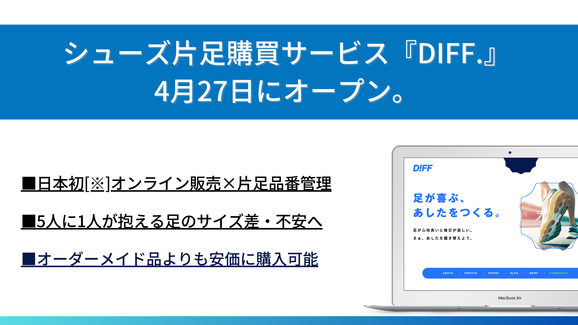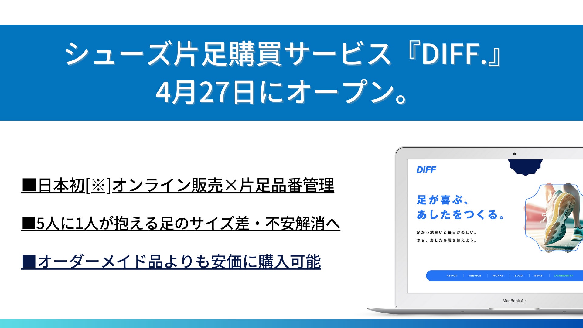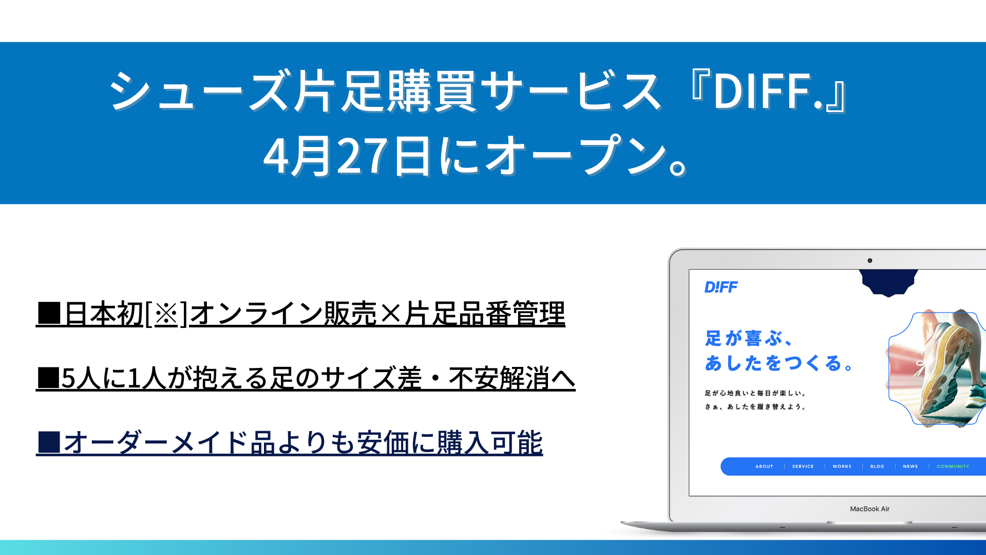 4月27日、シューズ片足購買サービス『DIFF.』が販売サイトを公開。日本初[※]の販売・管理システムで左右別サイズ購入が可能に
