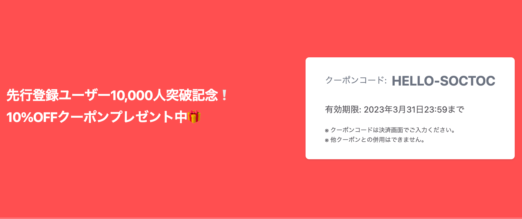 - 先行登録ユーザー10,000人突破記念クーポンを3月末まで配布決定