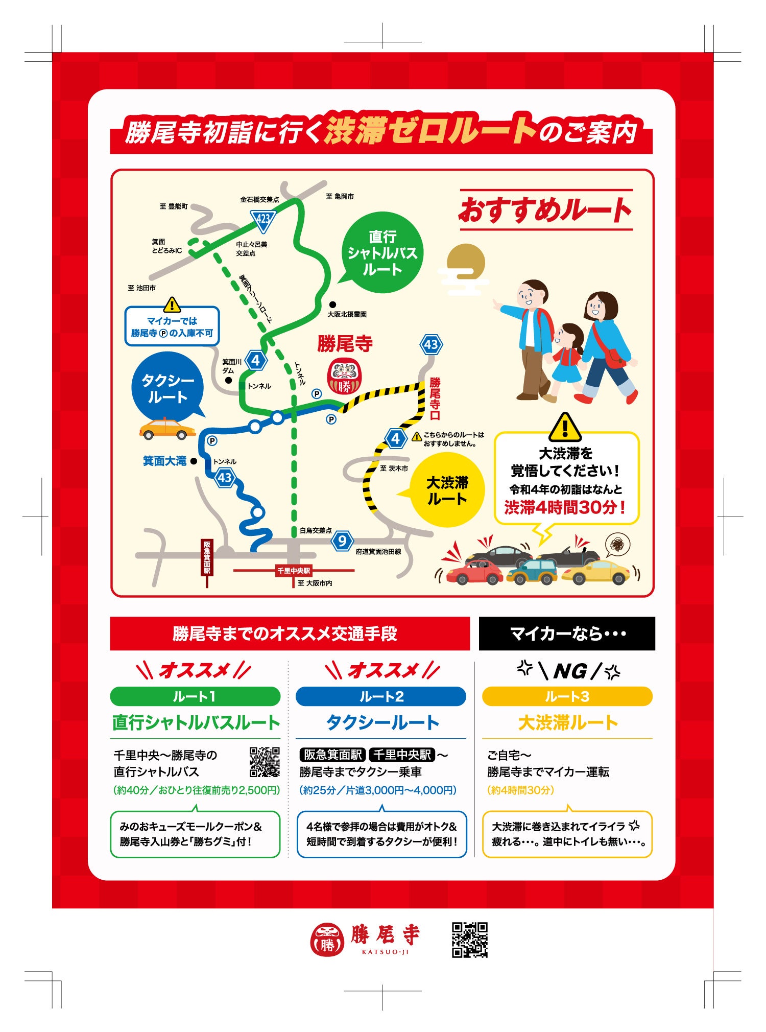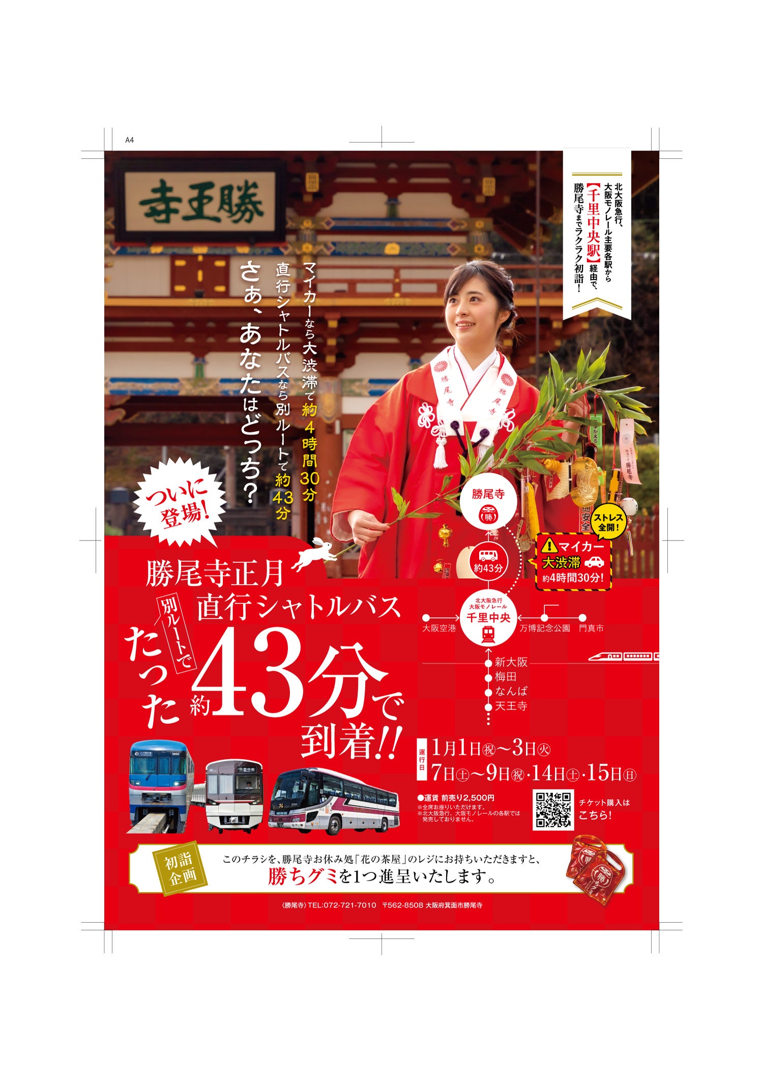 1300年の昔より“勝運の寺”として信仰されてきた『勝尾寺』と、千里中央駅前『千里阪急ホテル』間を結ぶ、正月期間限定の『この正月、私は渋滞知らず 勝尾寺初詣シャトルバス』を阪急交通社(株)が運行。復路は、みのおキューズモールを経由します。