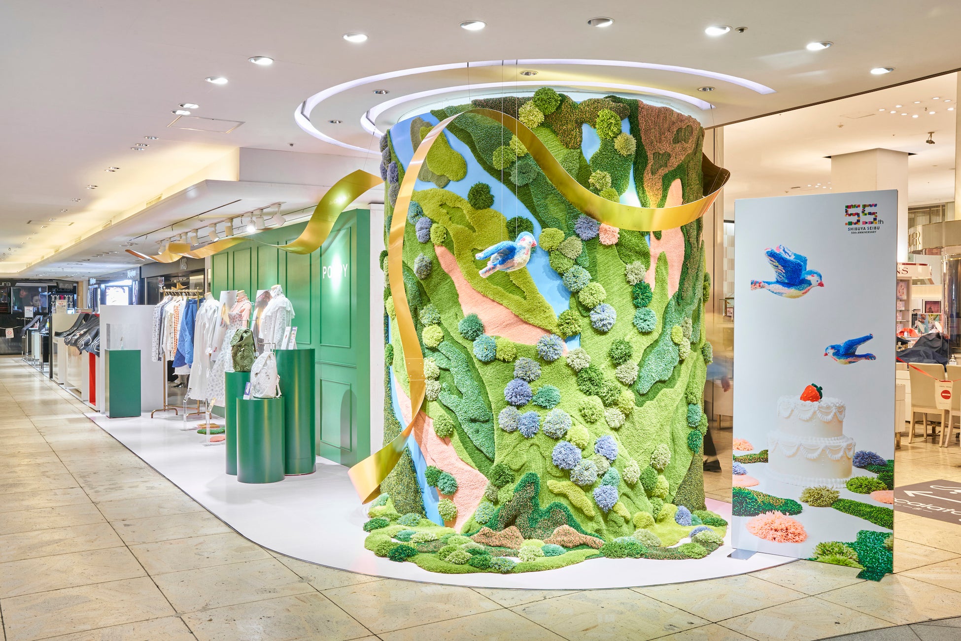 西武渋谷店の55年という長い歴史を「糸」「紡ぐ」「層」というワードから、みんながお祝いしたくなるハッピーな作品を作りたいと考えました。