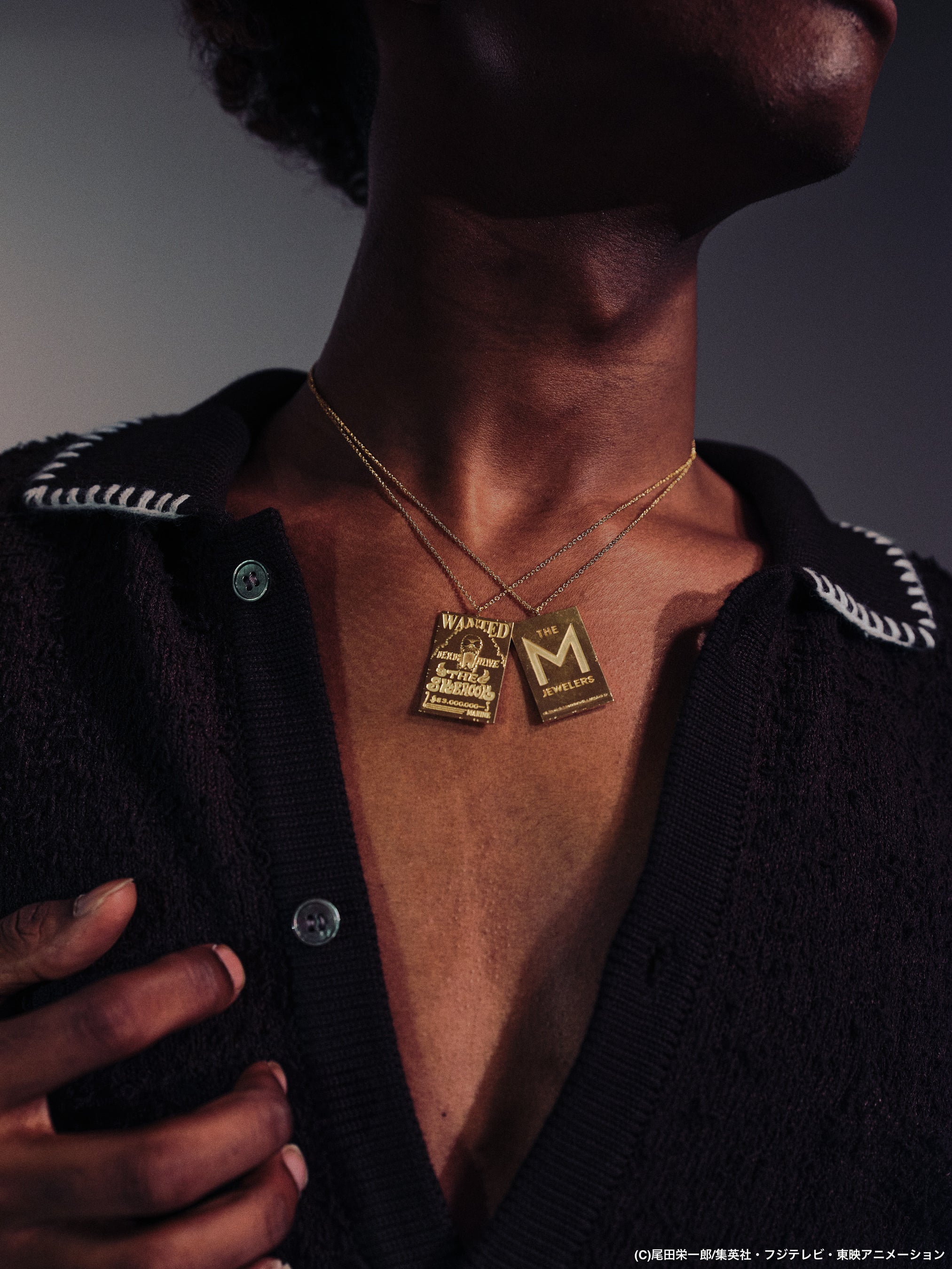 麦わらの一味とシャンクスの海軍発行公式手配書をモチーフにしたペンダントネックレスは、裏面の〈The M Jewelers〉のロゴと気分に合わせて使い分けれるリバーシブル仕様の全11種展開。ペンダント部分は職人によるハンドメイドの工程を挟むことで細部まできめ細やかな仕上がりとなっています。マザーオブパールを使用したパールネックレスは、作中でエースが着用していたハットのデザインを〈The M Jewelers〉を代表する人気商品「The Pearl Necklace」に落とし込んだファッショナブルなアイテムで、いずれも(シルバー925 / 18Kゴールドヴェルメイユ / 18Kゴールド)のオプションから選択可能となっております。