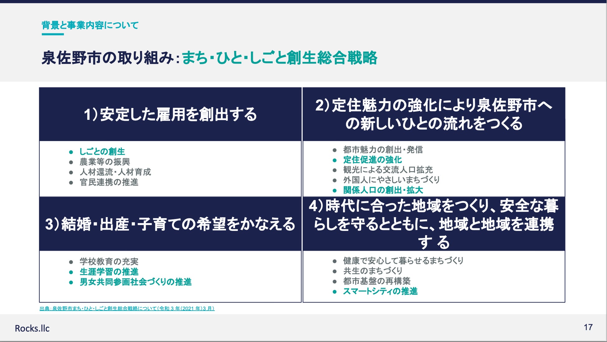 泉佐野市は、移住促進と雇用創出のため、「まち・ひと・しごと創生総合戦略」に基づく施策を実施。