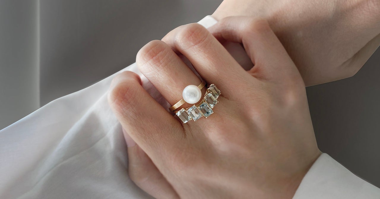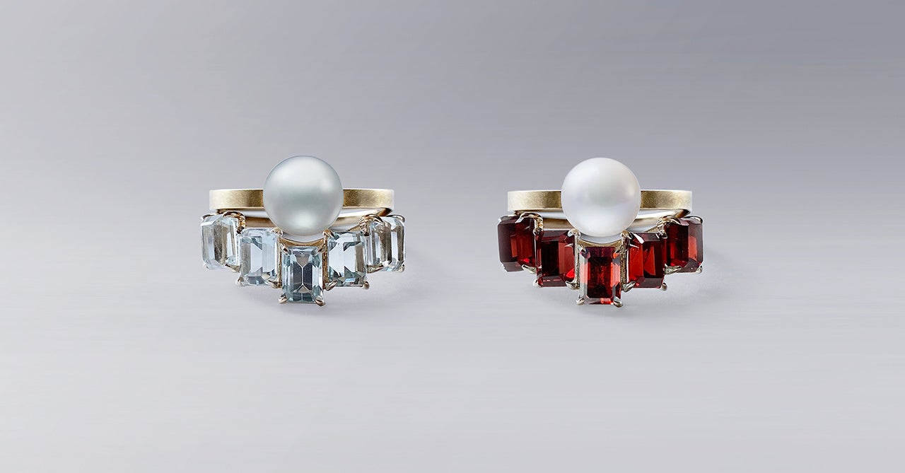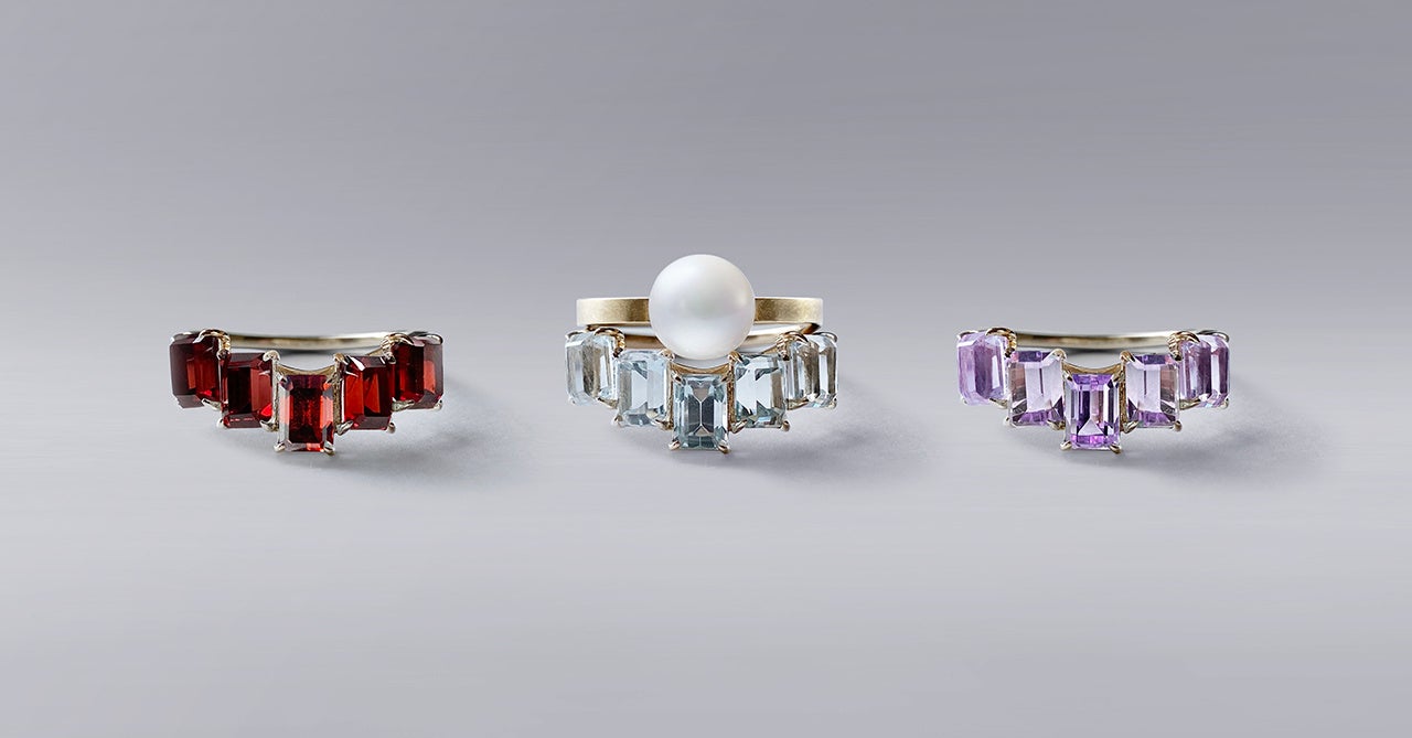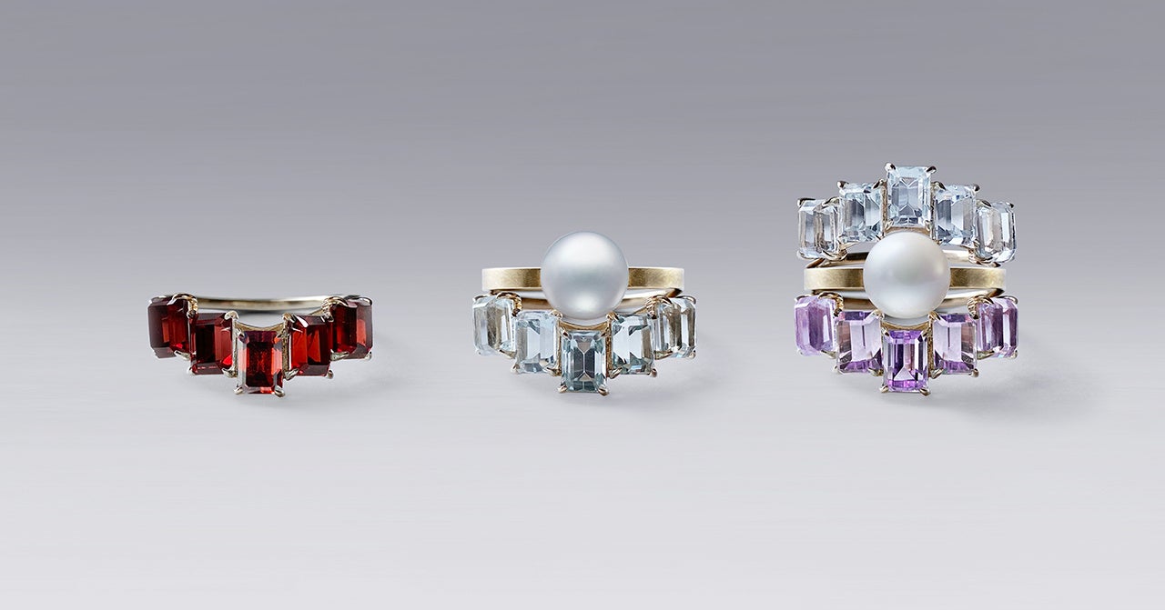 カラーストーンリング、一粒パールリング、存在感十分な3アイテムで構成されるセットリング「FLOAT “three-piece ring”」(写真右)。