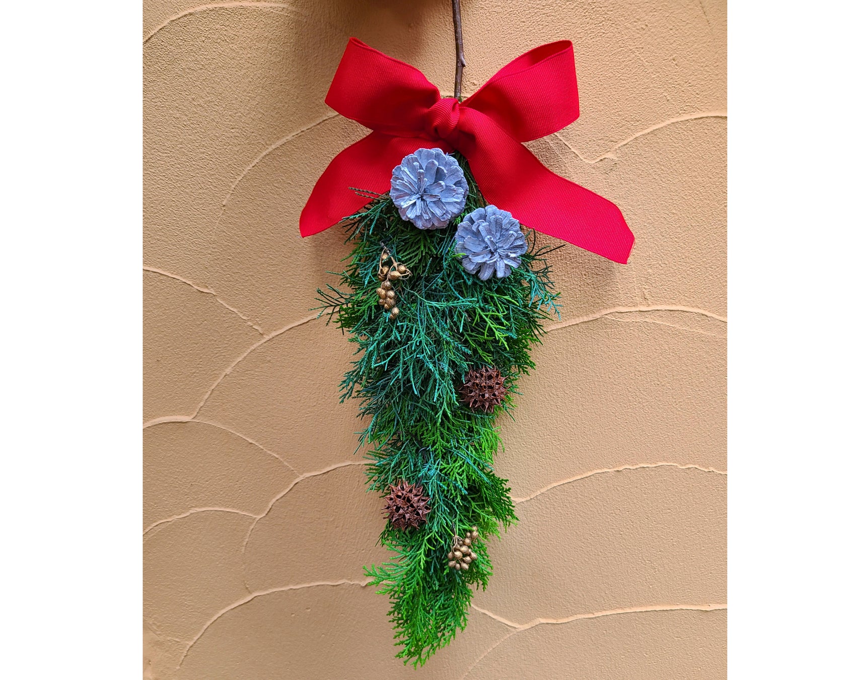 異なる植物素材、ヒバ,ユーカリ,ヒイラギなどの枝を混ぜることで、豊かなテクスチャとさまざまなグリーンの色が混ざりあった1つの美しいドア飾りをつくります。