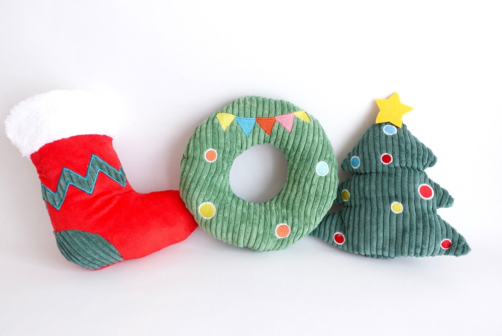 クリスマスツリー、サンタさんの靴下、クリスマスリースの3点セット。